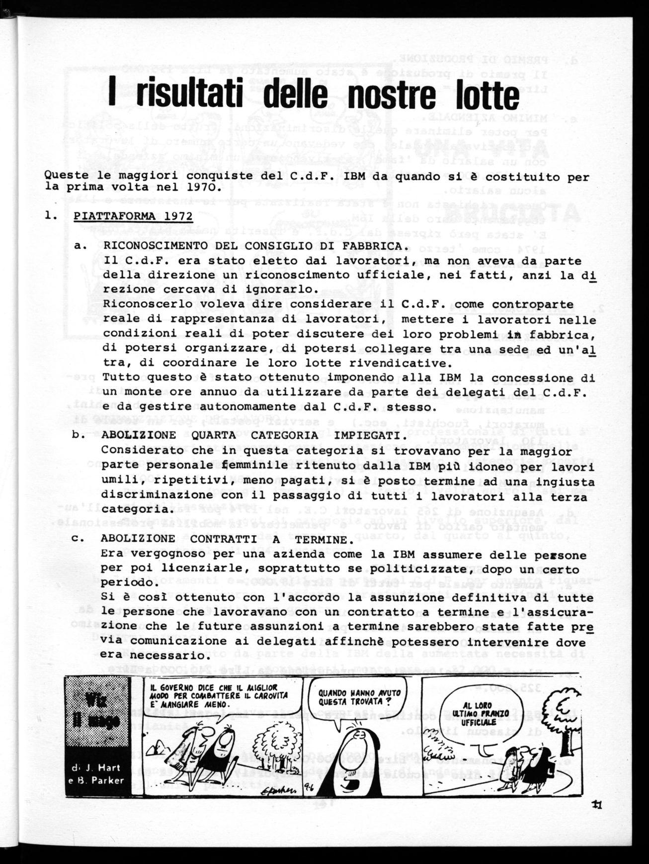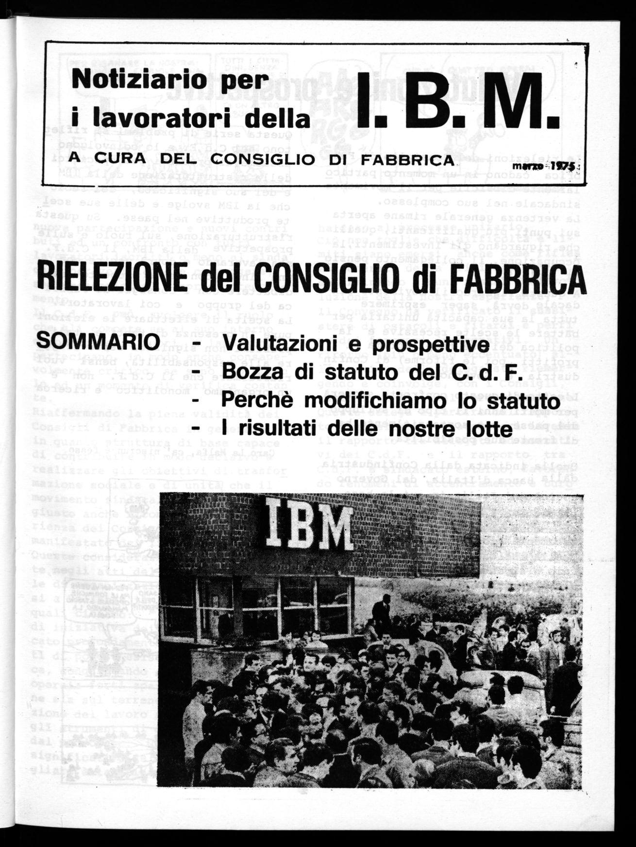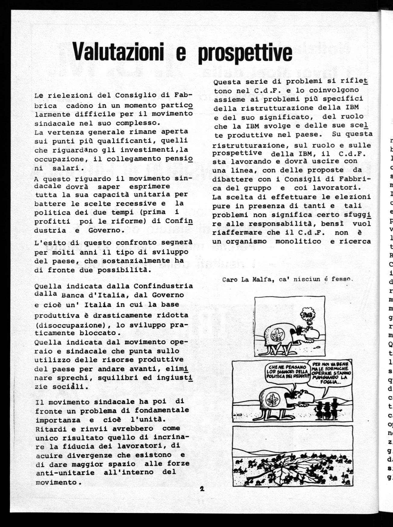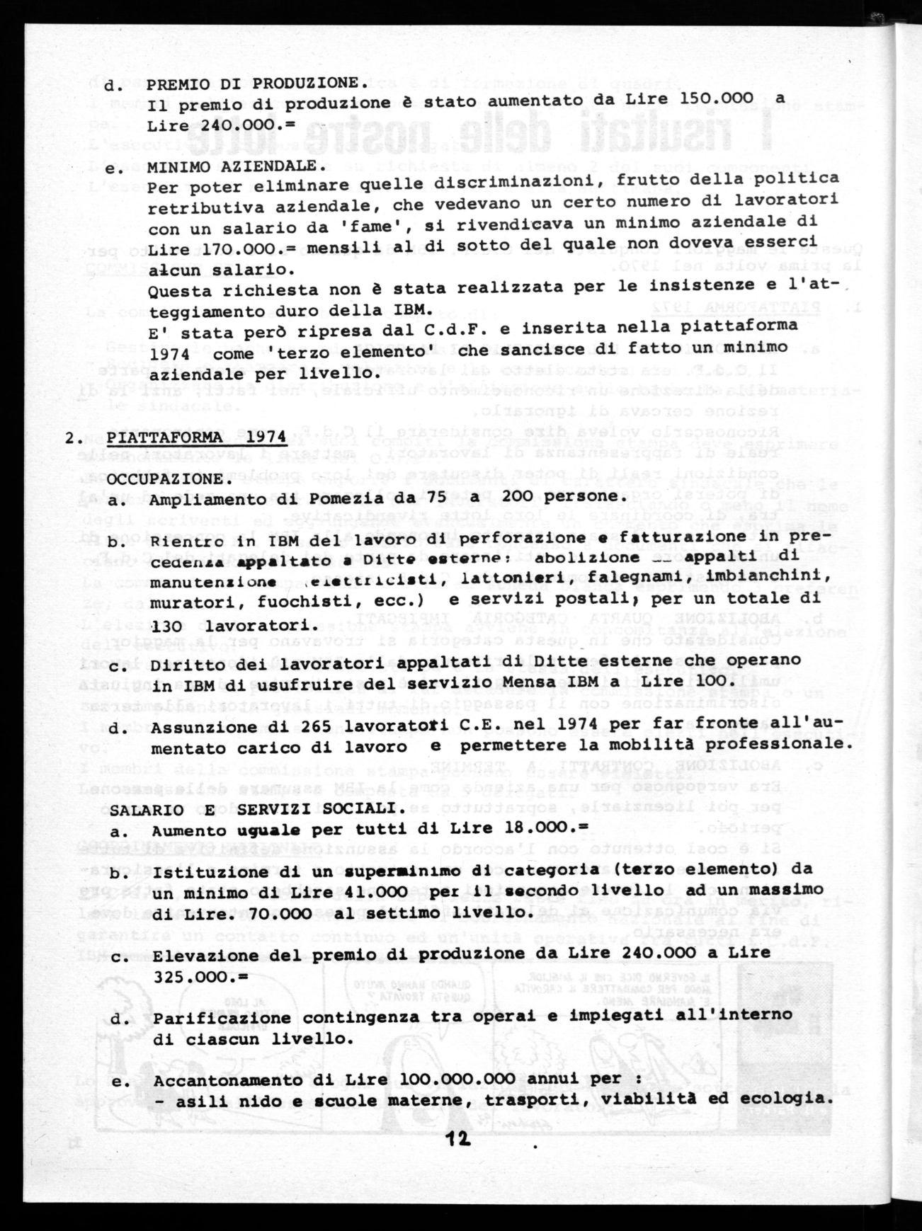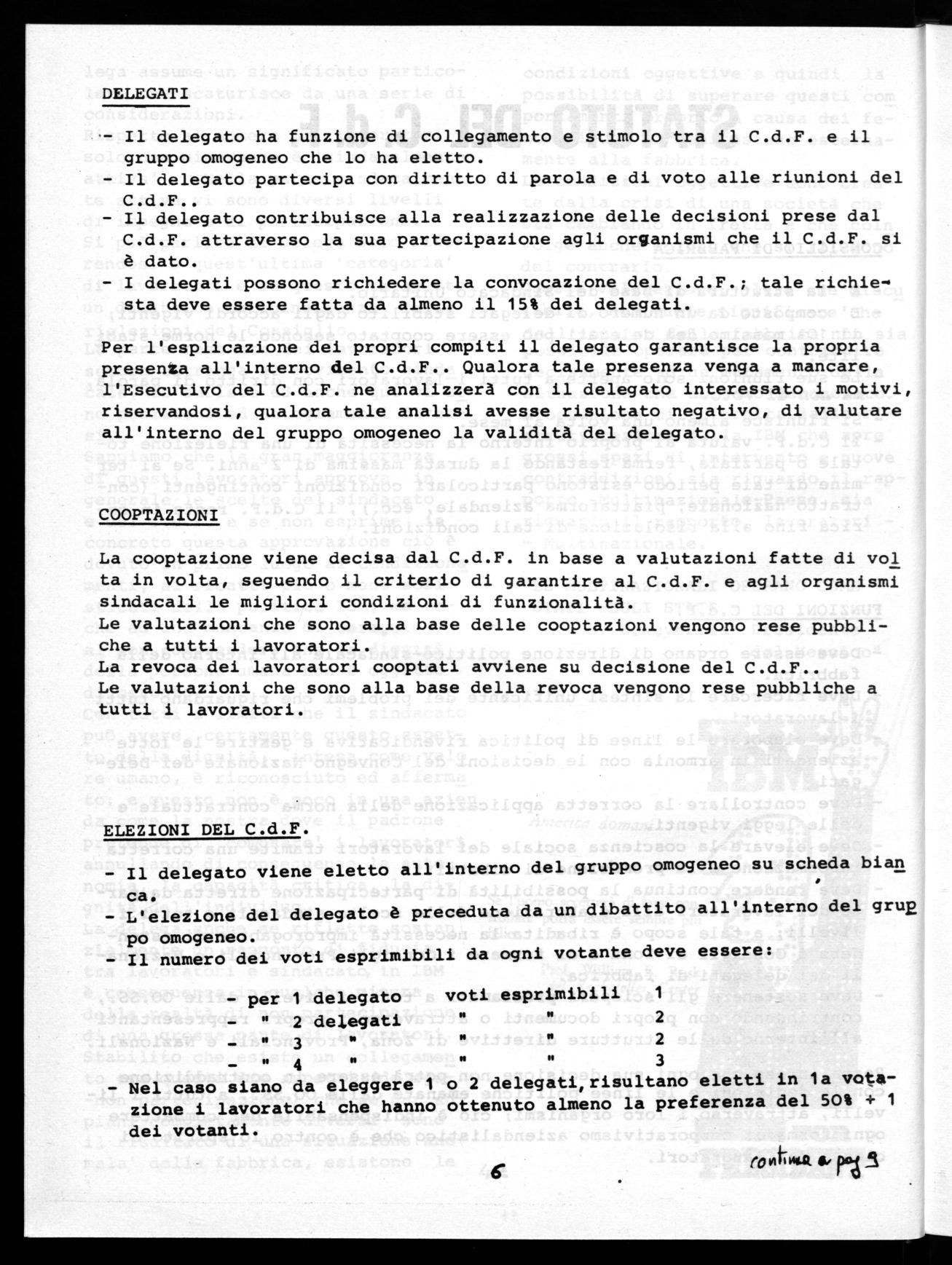 Questa serie di problemi si riflet tono nel C.d.F. e lo coinvolgono assieme ai problemi più specifici della ristrutturazione della IBM e del suo significato, del ruolo che la IBM svolge e delle sue scel te produttive nel paese. Su questa ristrutturazione, sul ruolo e sulle prospettive della IBM, il C.d.F. sta lavorando e dovrà uscire con una linea, con delle proposte da dibattere con i Consigli di Fabbrica del gruppo e coi lavoratori. La scelta di effettuare le elezioni pure in presenza di tanti e tali problemi non significa certo sfuggi re alle responsabilità, bensì vuol riaffermare che il C.d.F. non è un organismo monolitico e ricerca