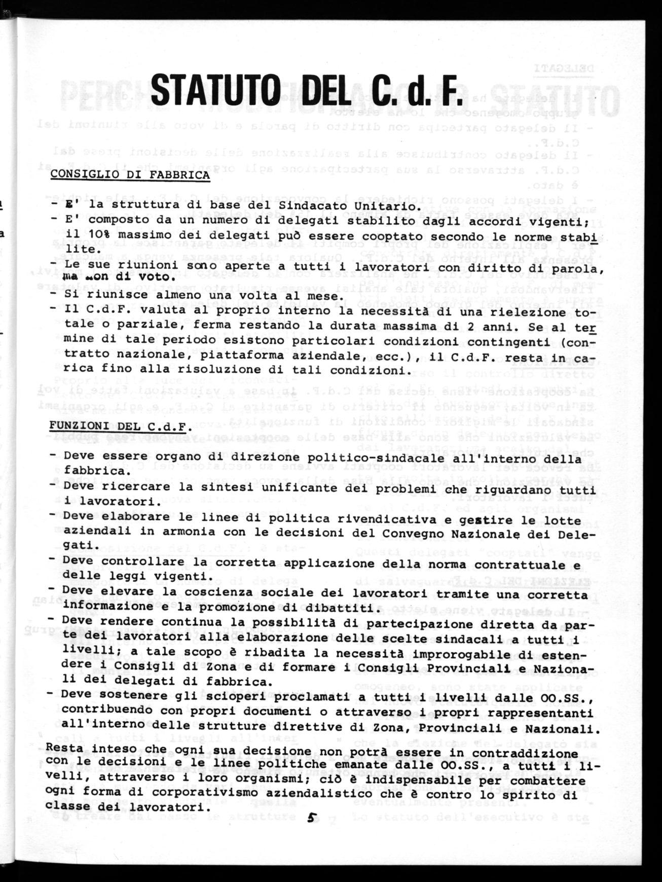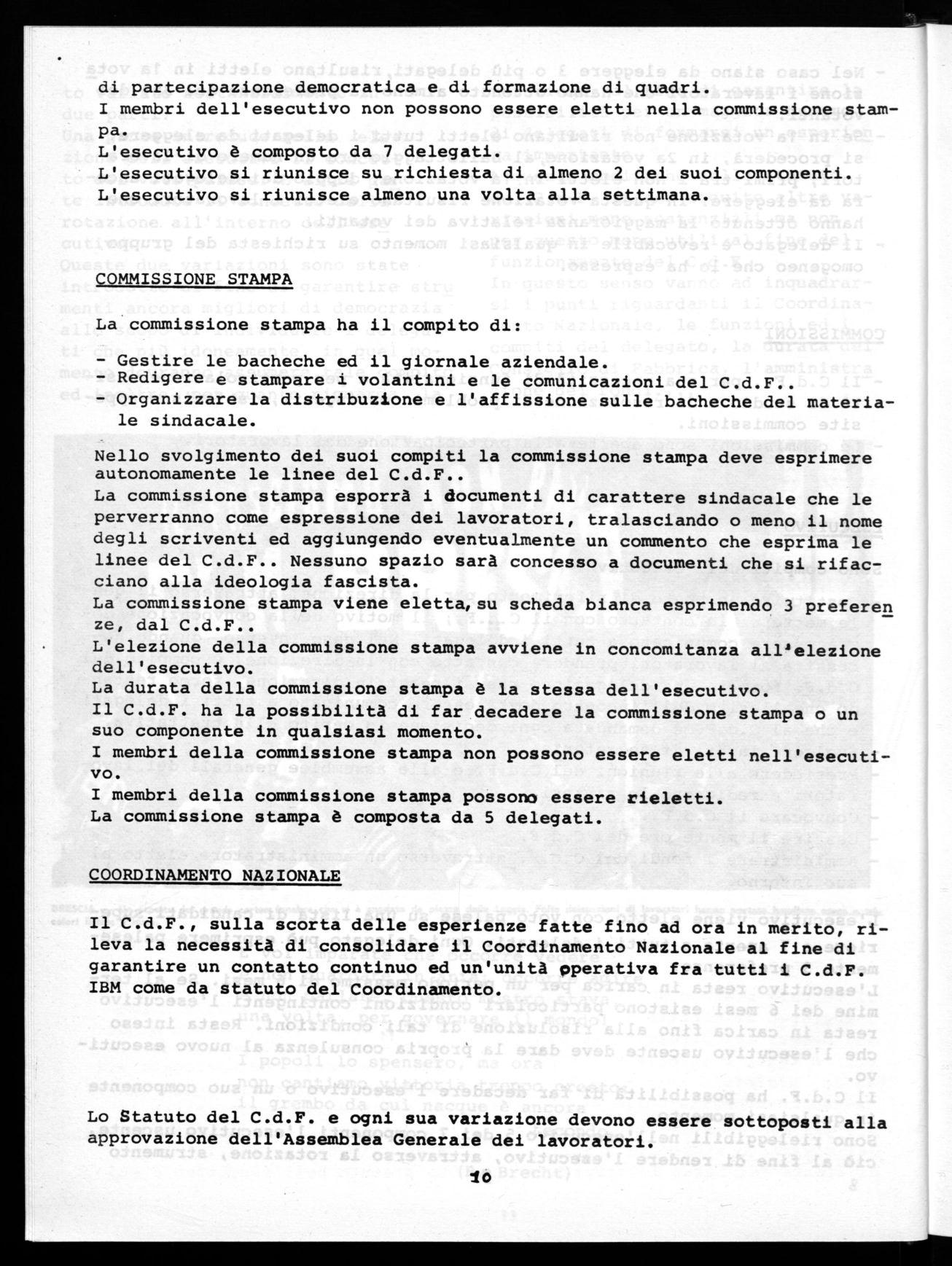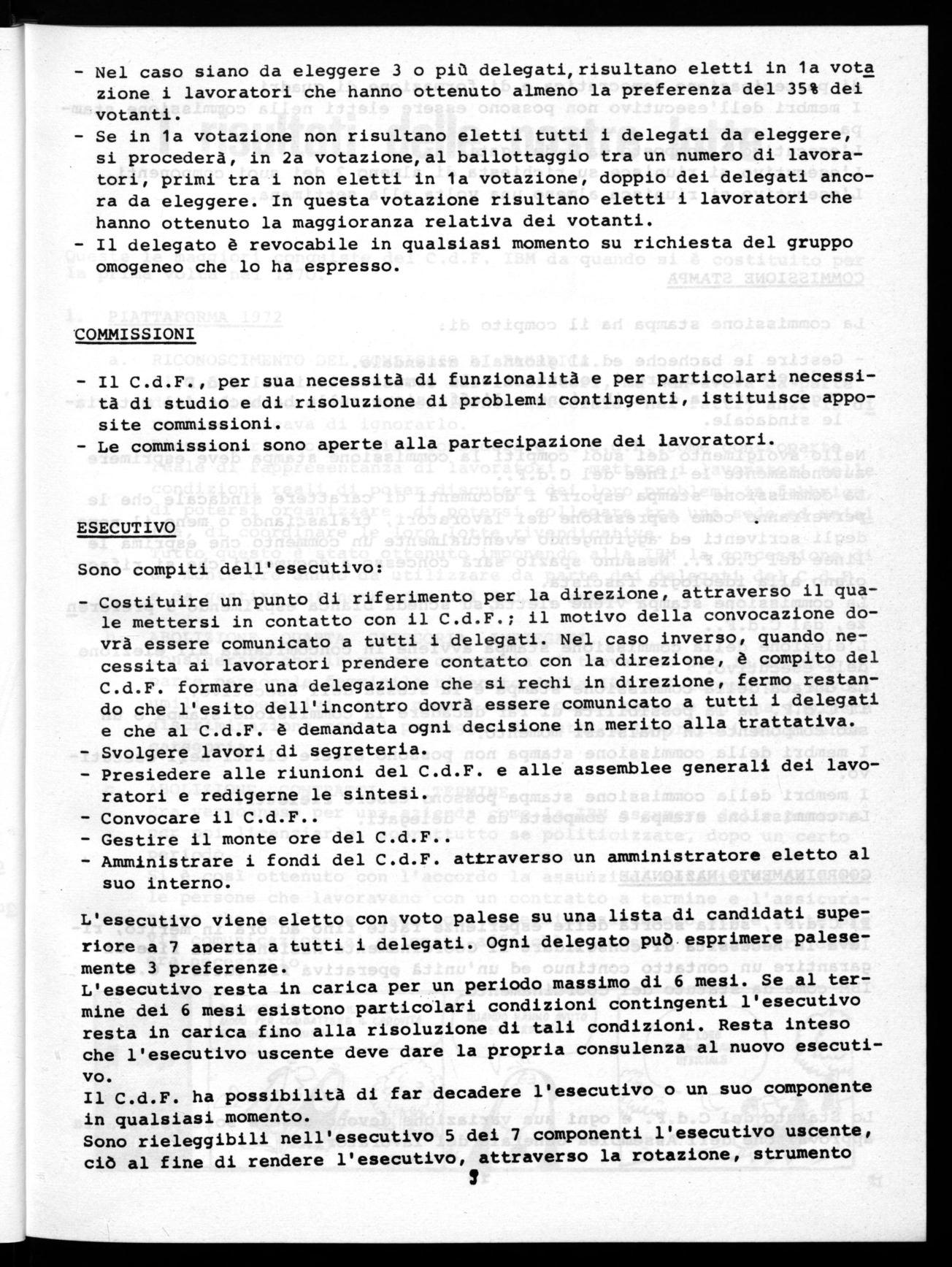 La commissione stampa esporrà i documenti di carattere sindacale che le perverranno come espressione dei lavoratori, tralasciando o meno il nome degli scriventi ed aggiungendo eventualmente un commento che esprima le linee del C.d.F.. Nessuno spazio sarà concesso a documenti che si rifacciano alla ideologia fascista.