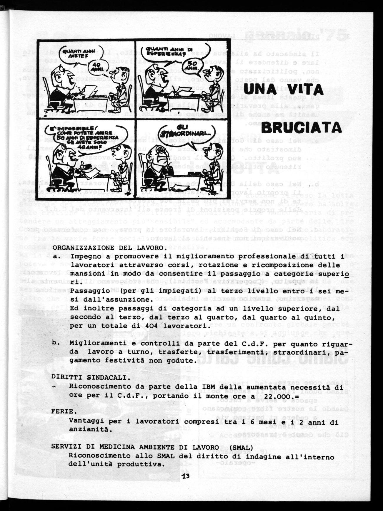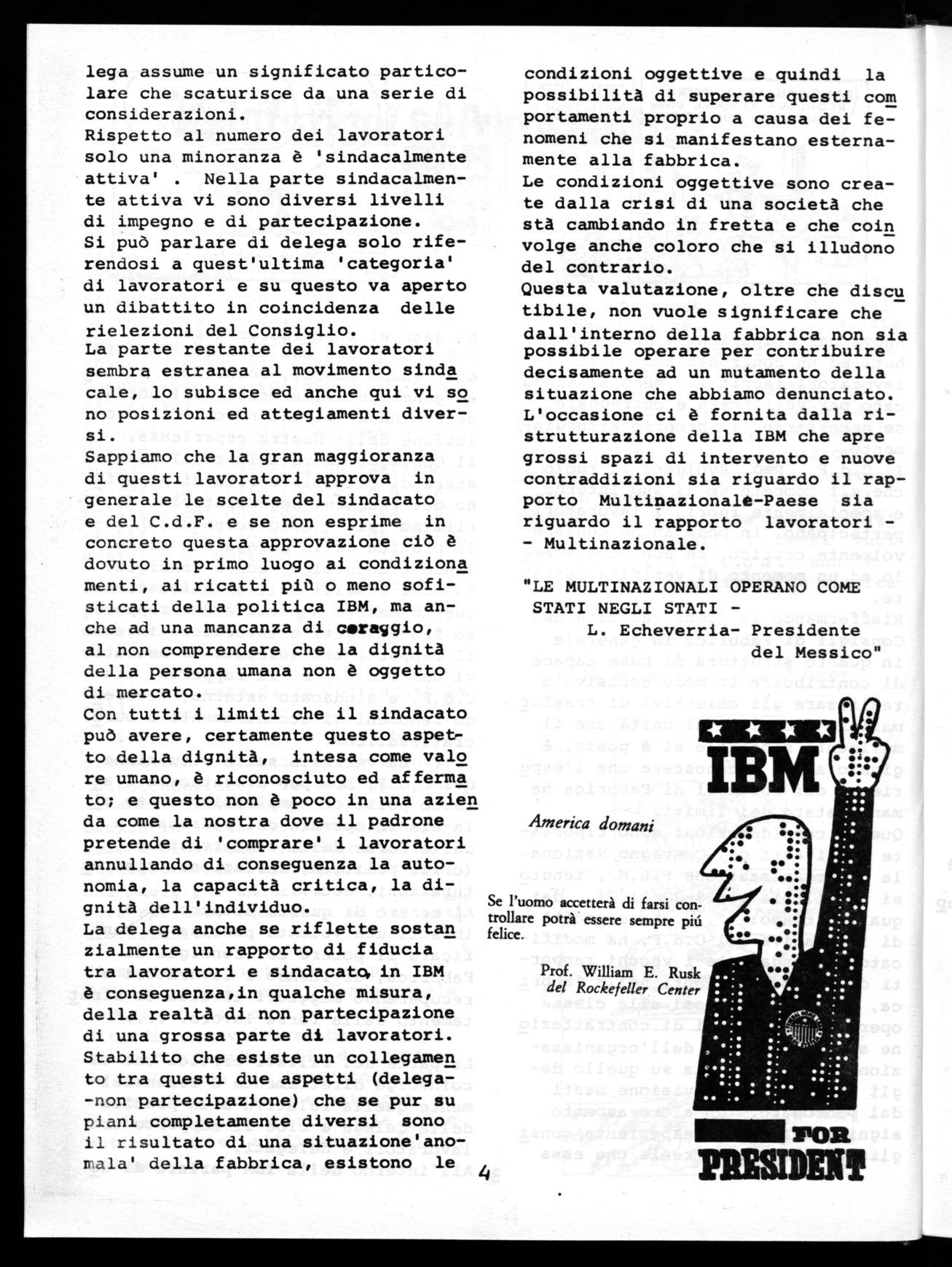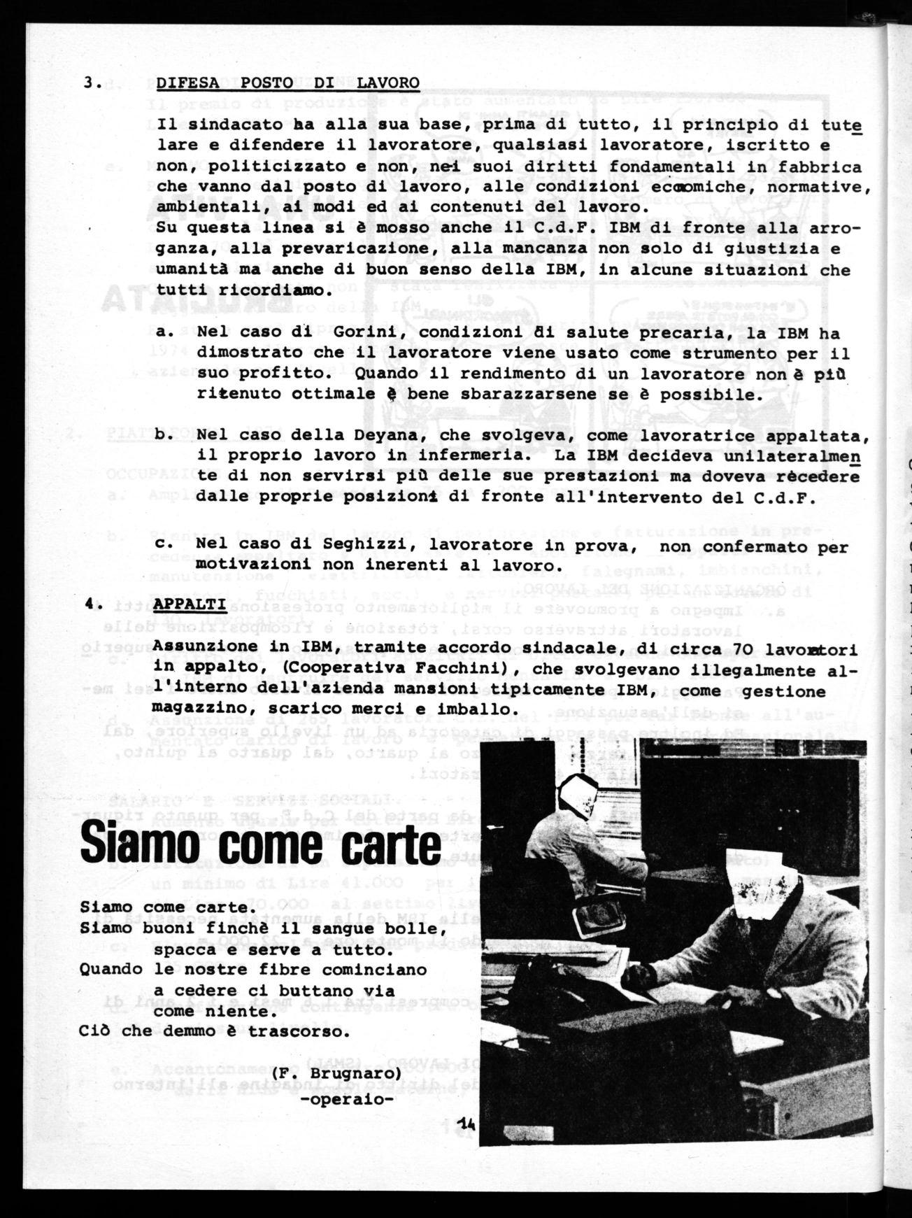 Sappiamo che la gran maggioranza di questi lavoratori approva in generale le scelte del sindacato e del C.d.F. e se non esprime in concreto questa approvazione ciò è dovuto in primo luogo ai condiziona menti, ai ricatti più o meno sofisticati della politica IBM, ma anche ad una mancanza di c•raggio, al non comprendere che la dignità della persona umana non è oggetto di mercato.