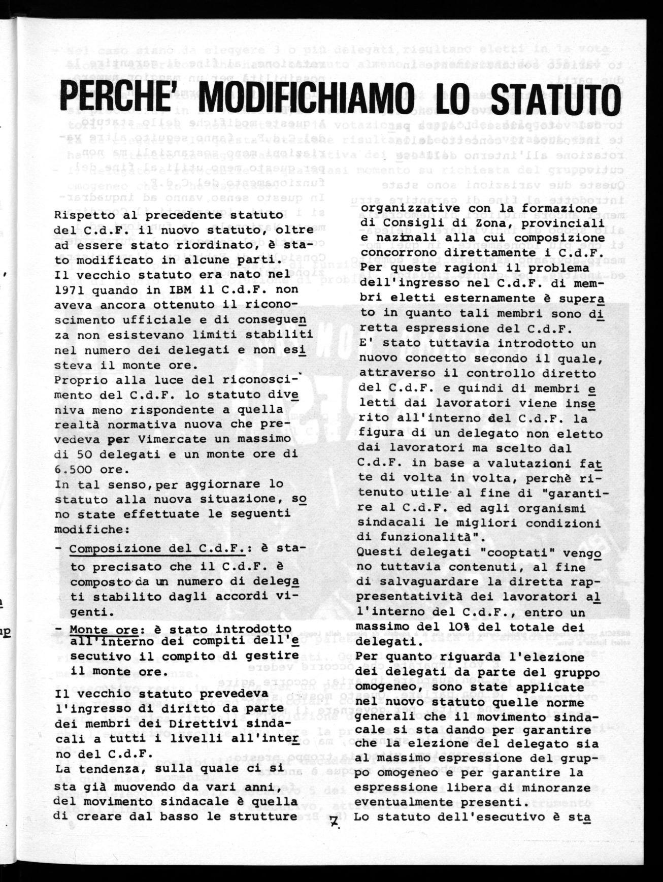 Rispetto al precedente statuto del C.d.F. il nuovo statuto, oltre ad essere stato riordinato, è stato modificato in alcune parti. Il vecchio statuto era nato nel 1971 quando in IBM il C.d.F. non aveva ancora ottenuto il riconoscimento ufficiale e di conseguen za non esistevano limiti stabiliti nel numero dei delegati e non esi steva il monte ore.