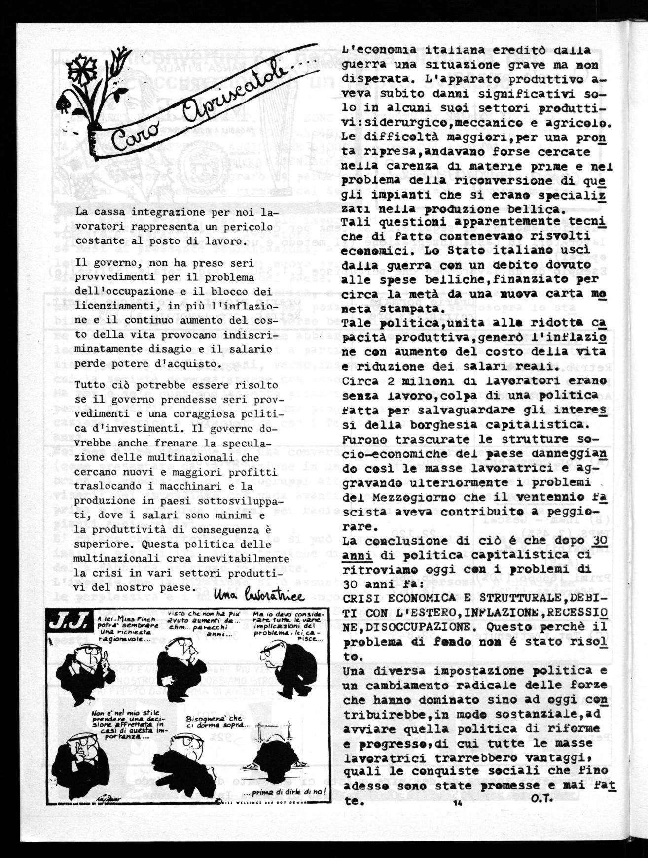 Una diversa impostazione politica e un cambiamento radicale delle forze che hanno dominato sino ad oggi con tribuirebbe,in modo sostanzialelad avviare quella politica di riforme e progressoldi cui tutte le masse lavoratrici trarrebbero vantaggi, quali le conquiste sociali che fino adesso sono state promesse e mai fat te. 14 O.T.