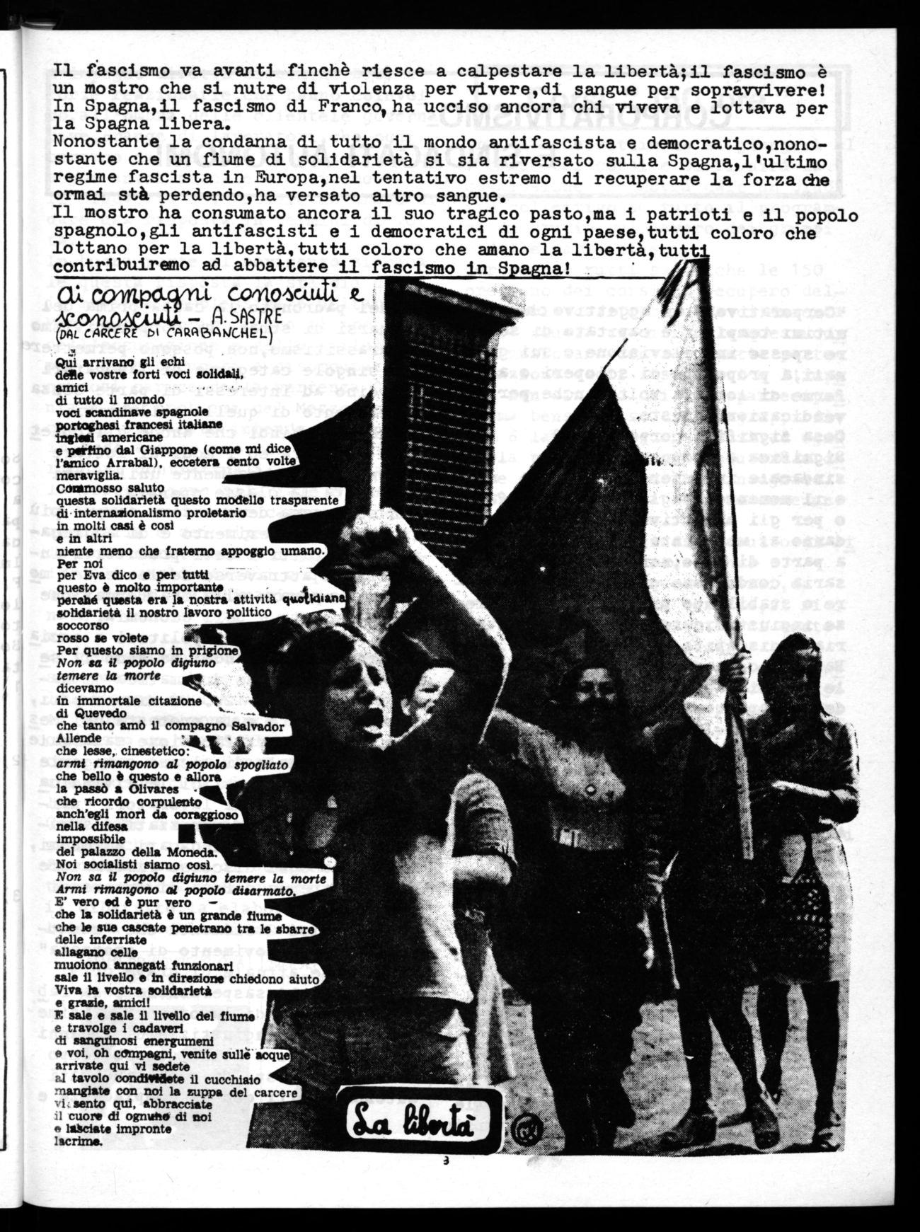 Nonostante la condanna di tutto il mondo antifascista e democratico,nonostante che un fiume di solidarietà si sia riversato sulla Spagna,leultimo regime fascista in Europa,nel tentativo estremo di recuperare la forza che ormai stà perdendo,ha versato altro sangue.