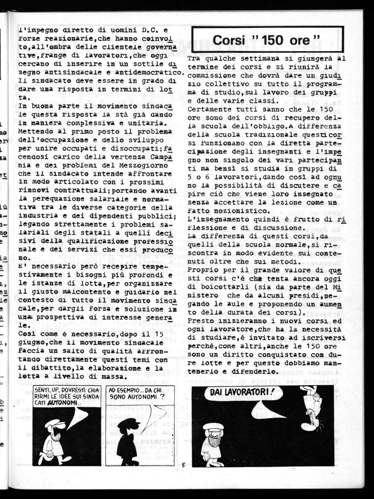 Certamente tutti sanno che le 150 ore sono dei corsi di recupero della scuola dell'obbligo.A differenza della scuola tradizionale questi cor si funzionano con la diretta partecipazione degli insegnanti e l'impe gno non singolo dei vari partecipan ti ma bensì si studia in gruppi di 5 o 6 lavoratori,dando così ad ognu no la possibilità di discutere e ca pire ciò che viene loro insegnato senza accettare la lezione come un fatto nozionistico.