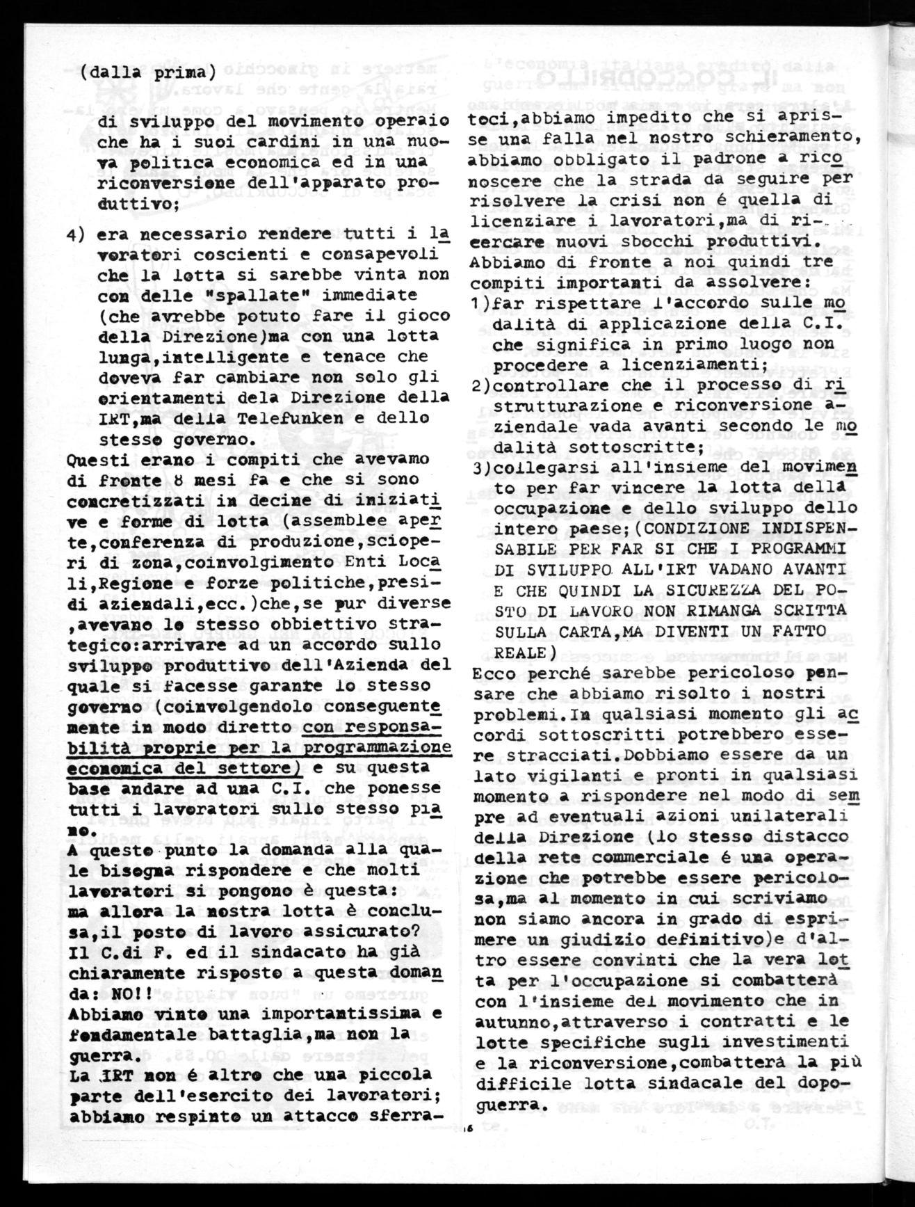 4) era necessario rendere tutti i la voratori coscienti e consapevoli che la lotta si sarebbe vinta non con delle "spallate" immediate (che avrebbe potuto fare il gioco della Direzione)ma con una lotta lunga,intelligente e tenace che doveva far cambiare non solo gli orientamenti dela Direzione della IRT,ma della Telefunken e dello stesso governo.