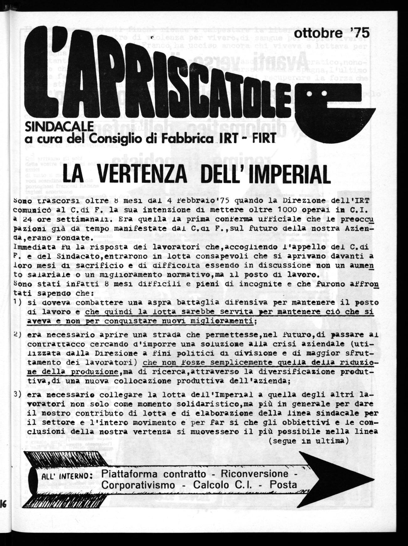 era necessario collegare la lotta dell'Imperial a quella degli altri lavoratori non solo come momento solidaristico,ma più in generale per dare il nostro contributo di lotta e di elaborazione della linea sindacale per il settore e l'intero movimento e per far si che gli obbiettivi e le conclusioni della nostra vertenza si muovessero il più possibile nella linea (segue in ultima)