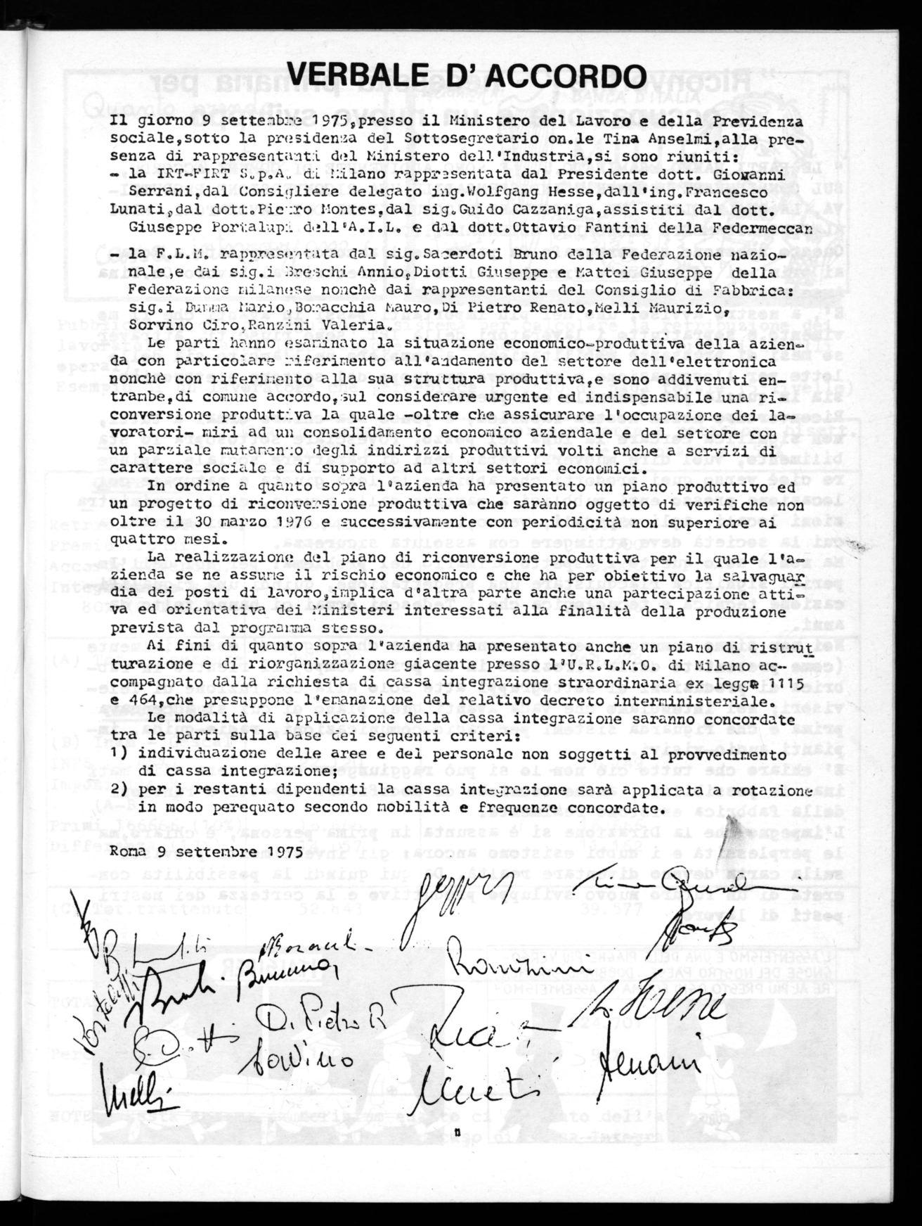Il giorno 9 settentree 1975,presso il Ministero del Lavoro e della Previdenza sociale,sotto la presidenea del Sottosearetario on.le Tina Anselmi,alla presenza di rappresentanti del Ministero dell'Industria,si sono riuniti: la IRT-FIRT S.p.A. di Milano rape esentata dal Presidente dott. Giovanni Serrani,dal Consigliere delegato ing.Wolfgang Hesse,dall'ing.Francesco Lunati dal dott.Pieero nontes,dal sig.Guido Cazzaniga,assistiti dal dott. Giuseppe Poralupe dell'A.I.L, e dal dott.Ottavio Fantini della Federmeccan la F.L.M. rappresentata dal sig.Saeerdoti Bruno della Federazione nazionale,e dai sig.i 3reschi Annio,Diotti Giuseppe e Mattei Giuseppe della Federazione milanese noechè dai rappresentanti del Consiglio dì Fabbrica: sigoi Bord3a Mario,Bonacchia mauro,Di Pietro Renato, nielli Maurizio, Sorvino Ciro,Ranzini Valeria.