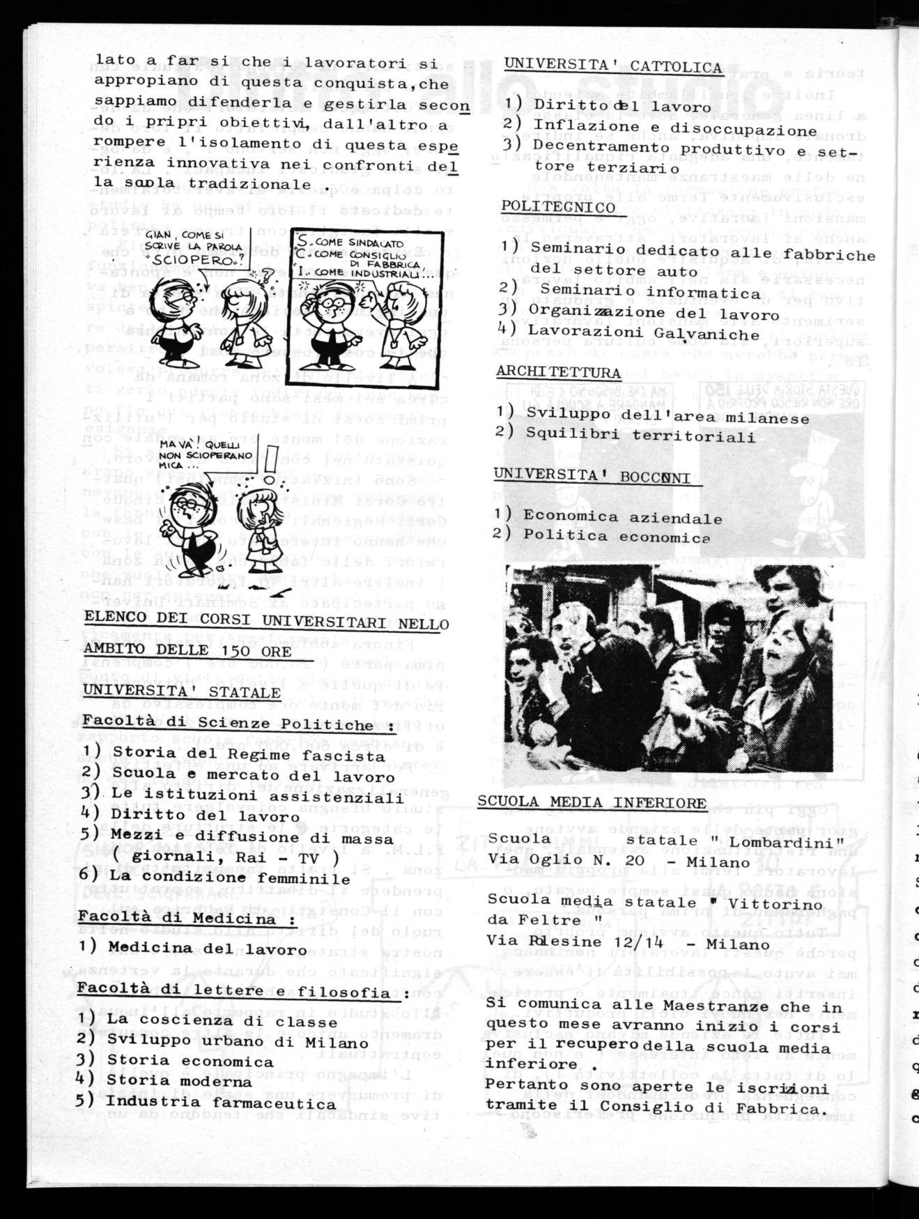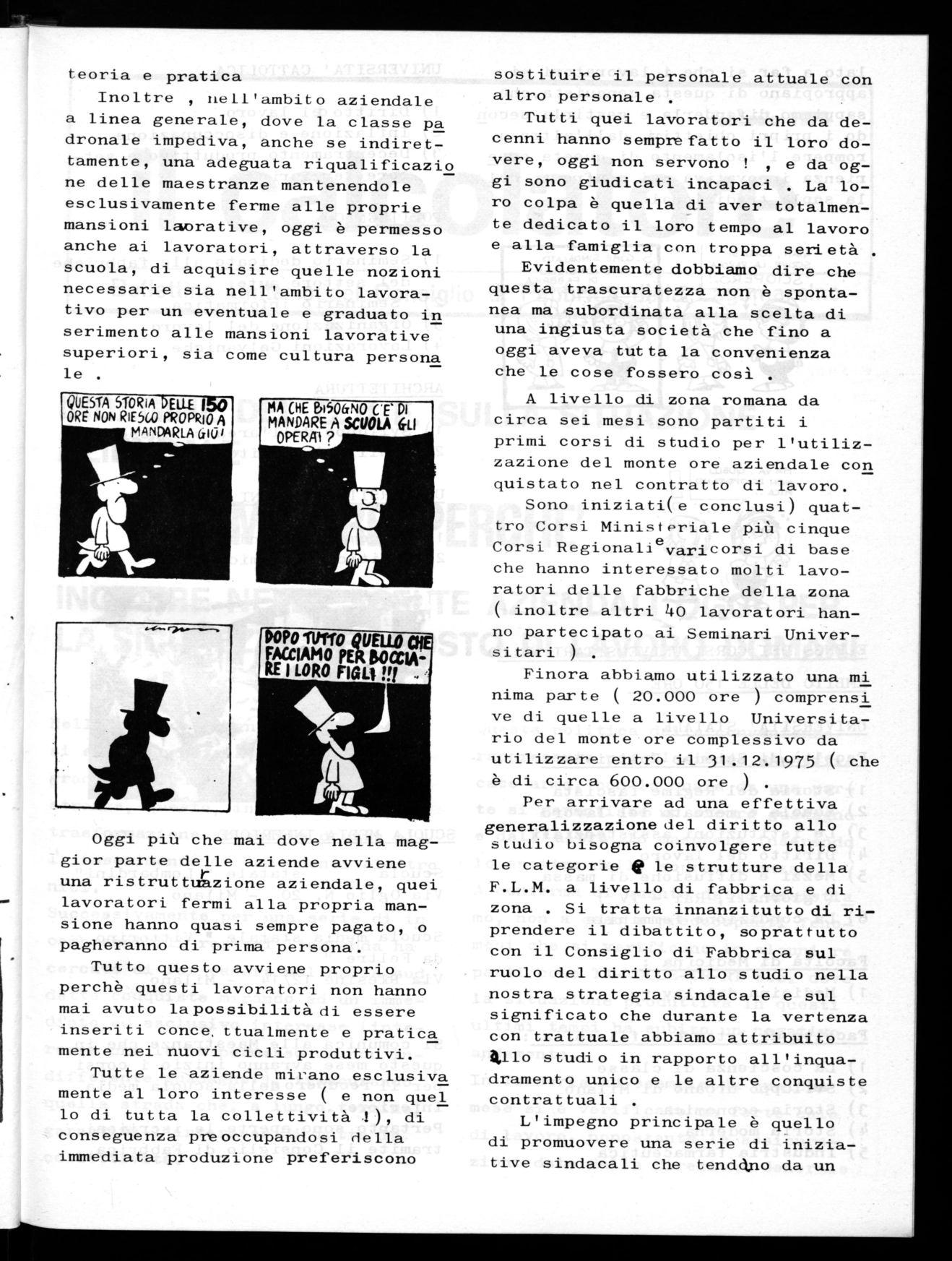 Per arrivare ad una effettiva generalizzazione del diritto allo studio bisogna coinvolgere tutte le categorie e le strutture della F.L.M. a livello di fabbrica e di zona . Si tratta innanzitutto di riprendere il dibattito, soprattutto con il Consiglio di Fabbrica sul ruolo del diritto allo studio nella nostra strategia sindacale e sul significato che durante la vertenza con trattuale abbiamo attribuito allo studio in rapporto all'inquadramento unico e le altre conquiste contrattuali .