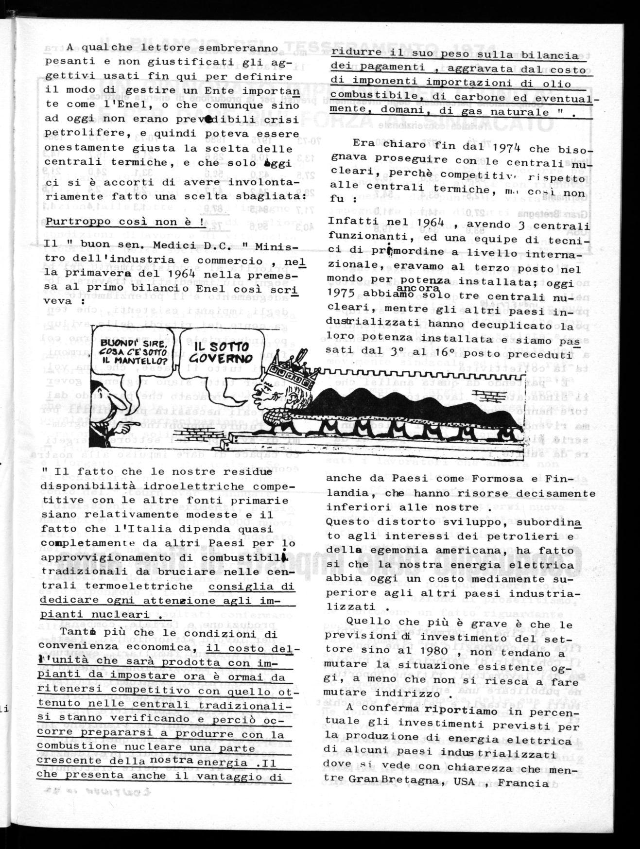 Il risultato pratico di questa operazione è stato, da un lato il completo asservimento dell 'Entedi stato alle grandi compagnie e ai petrolieri nostrani, e dall'altro l'affossamento del piano di costruzione di centrali nucleari di proget tazione e costruzione nazionale (che è quanto interessava agli americani). Si pensi che il costo di una centrale nucleare è all'incirca di 300 miliardi, e che circa il 30X cioè 90 miliardi vengono pagati agli ame ricani per la licenza di costruzione e la fornitura di alcuni componenti fattibili dalla nostra indu stria, da ciò si capiece quanto dele teria sia stata e sia questa politi ca che, oltre ad aggravare con impor tazioni e acquisto di licenza la bilancia di pagamenti o incide notevol mente anche sulla occupazione e sullo sviluppo industriale e tecnologi co del Mostro Paese .