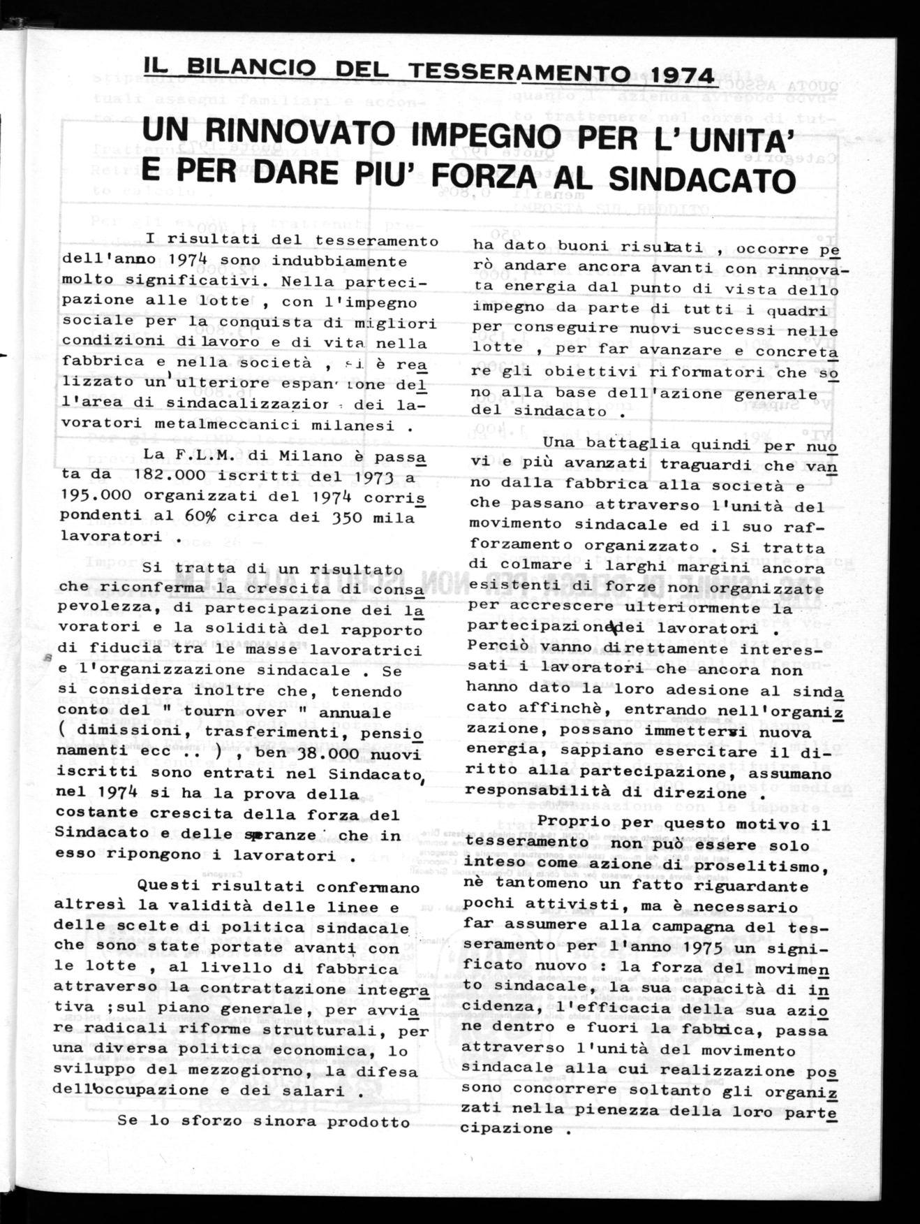 I risultati del tesseramento dell'anno 1974 sono indubbiamente molto significativi. Nella partecipazione alle lotte , con l'impegno sociale per la conquista di migliori condizioni di lavoro e di vita nella fabbrica e nella società , -1 è rea lizzato unulteriore esparr Ione del l'area di sindacalizzazior dei lavoratori metalmeccanici milanesi .