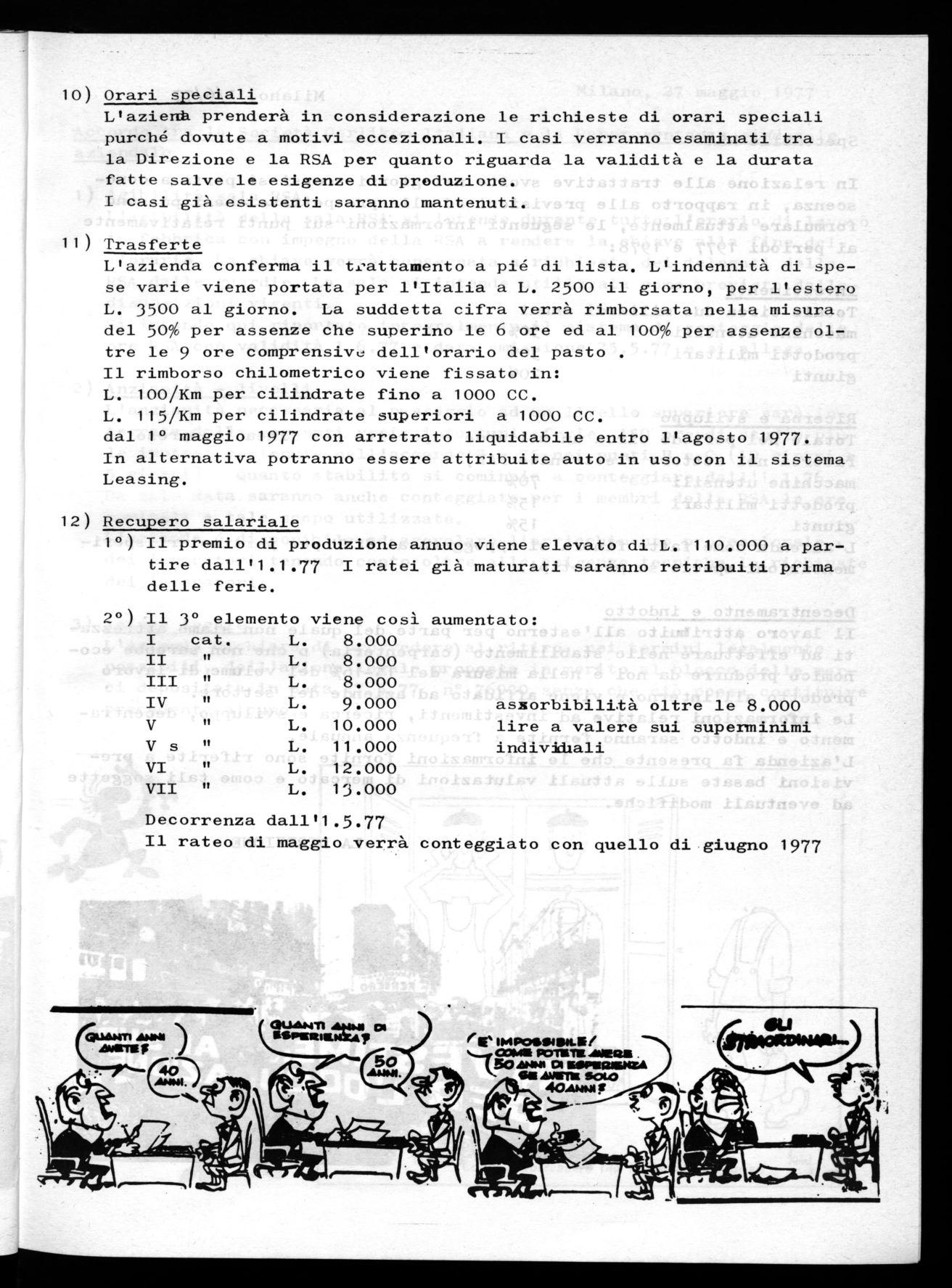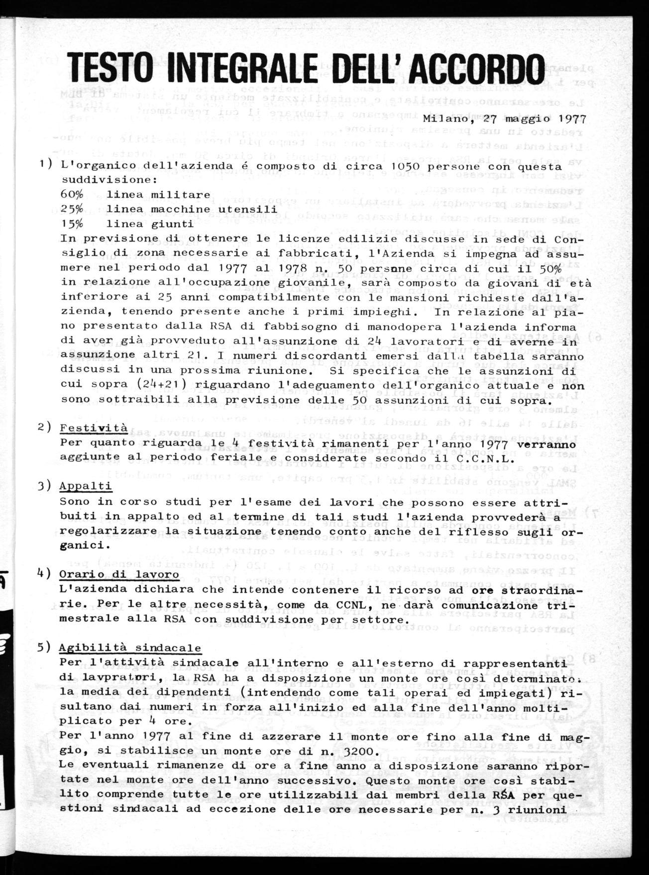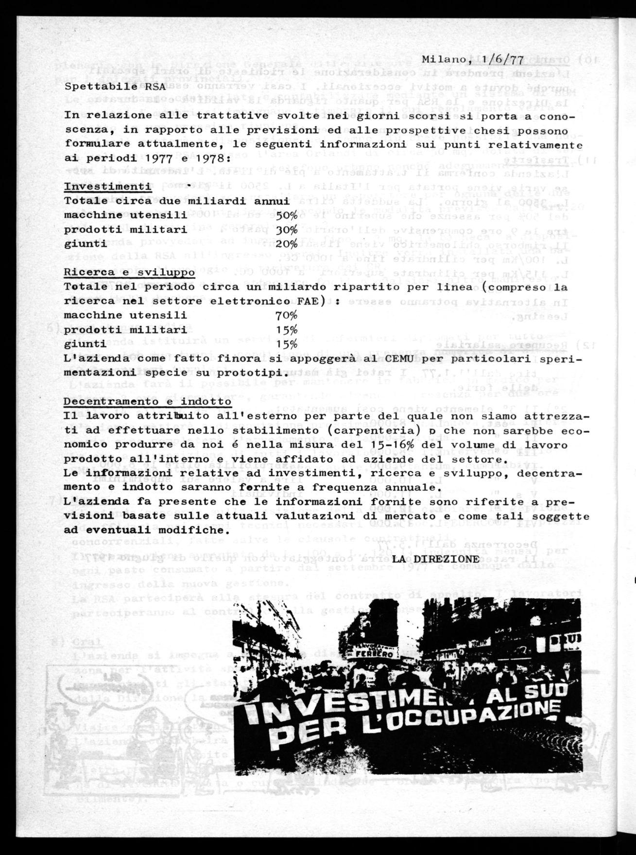 In previsione di ottenere le licenze edilizie discusse in sede di Consiglio di zona necessarie ai fabbricati, l'Azienda si impegna ad assumere nel periodo dal 1977 al 1978 n. 50 persnne circa di cui il 50% in relazione all'occupazione giovanile, sarà composto da giovani di età inferiore ai 25 anni compatibilmente con le mansioni richieste dall'azienda, tenendo presente anche i primi impieghi. In relazione al piano presentato dalla RSA di fabbisogno di manodopera l'azienda informa di aver già provveduto all'assunzione di 24 lavoratori e di averne in assunzione altri 21. I numeri discordanti emersi dalla tabella saranno discussi in una prossima riunione. Si specifica che le assunzioni di cui sopra (24+21) riguardano l'adeguamento dell'organico attuale e non sono sottraibili alla previsione delle 50 assunzioni di cui sopra.
