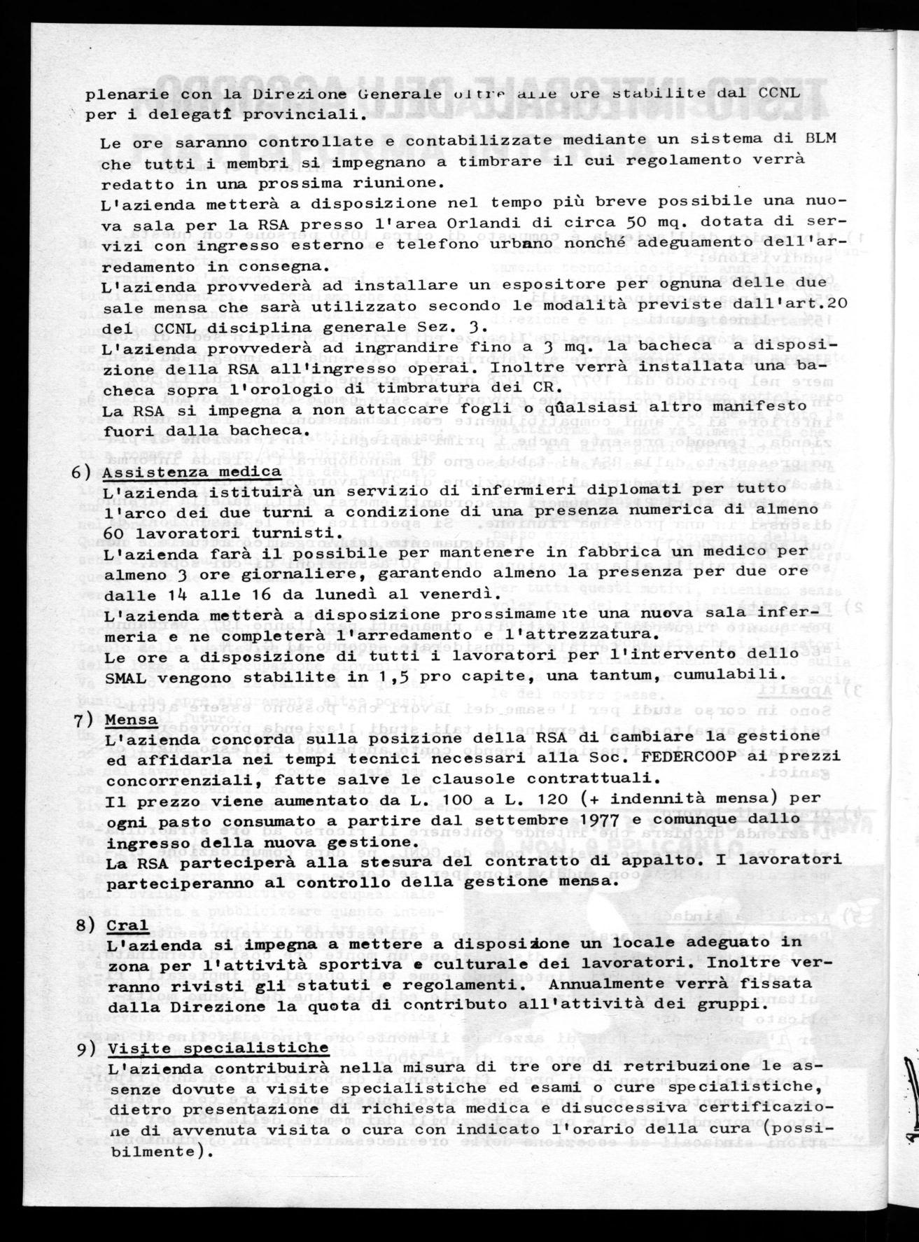 Già i due punti che abbiamo sottolineato precisano il significato che ha avuto la piattaforma, ma non va dimenticata che anche gli altri punti dell'accordo (il recupero salariare, l'assistenza medica lo SUL; la mensa ecc.)sono qualificanti sia politicamente che normativamente, costituendo oggettivamente un'altro passo avanti nel miglioramento delle condizioni generali di lavoro all'interno dell'O.I.