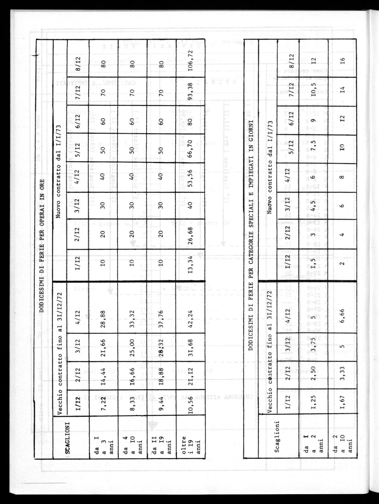 a) Il numero delle ore e dei giorni spet tanti di ferie sono normalmente ricavabili dalla lettura dei due prospetti sottoriportati e distinti per operai e impiegati senza fare conteggi. Se si verifica il caso che le ferie dell'operaio o dell'impiegato ín esame sono maturate, parte in uno .sca-. glione e parte nel successivo scaglio ne di ferie, è necessario usare il prospetto che riporta i dodicesimi di ferie annue al fine della determinazione delle ore e dei giorni spettanti.