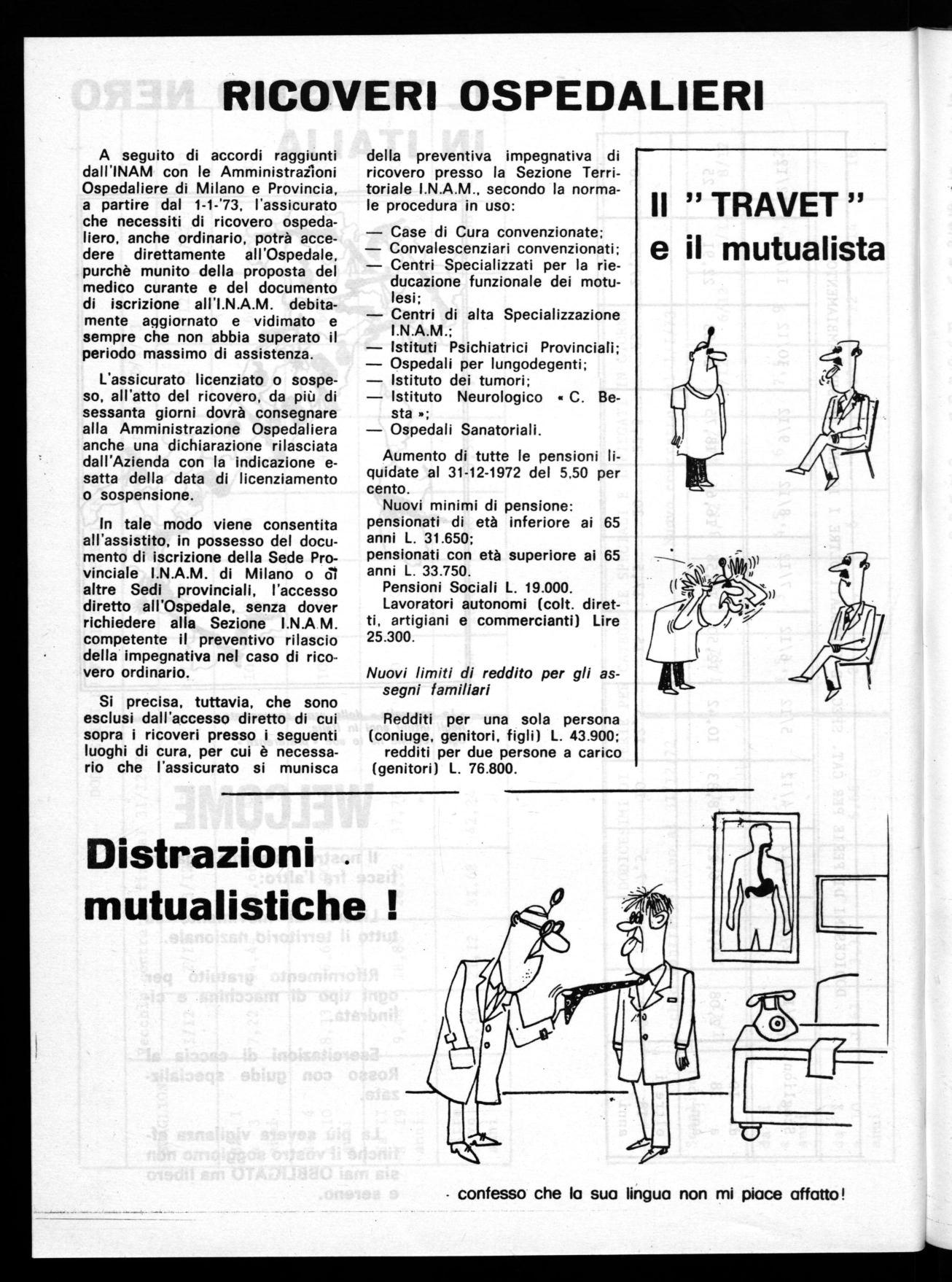 A seguito di accordi raggiunti dall'INAM con le Amministrazioni Ospedaliere di Milano e Provincia, a partire dal 1-1-'73, l'assicurato che necessiti di ricovero ospedaliero, anche ordinario, potrà accedere direttamente all'Ospedale, purchè munito della proposta del medico curante e del documento di iscrizione all'I.N.A.M. debitamente aggiornato e vidimato e sempre che non abbia superato il periodo massimo di assistenza.