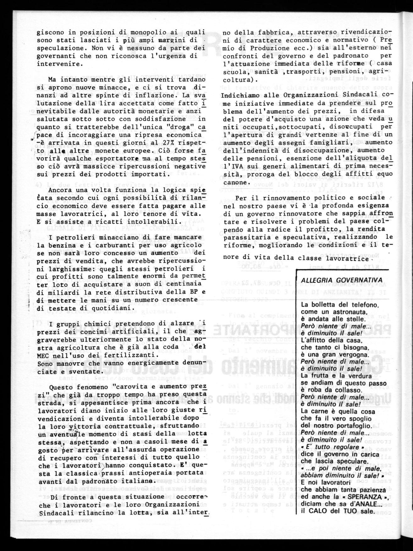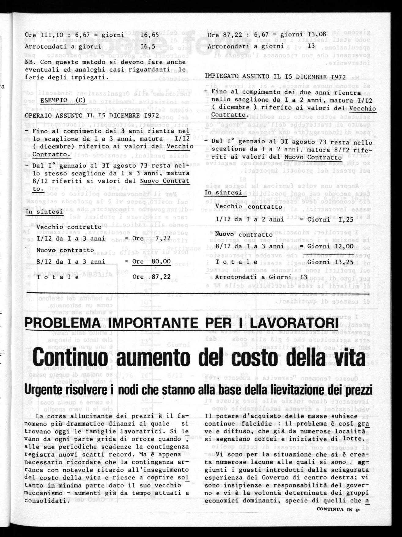 Indichiamo alle Organizzazioni Sindacali come iniziative immediate da prendere sul pro blema dell'aumento dei prezzi, in difesa del potere d'acquisto una azione che veda u niti occupati,sottocupati, disovcupati per l'apertura di grandi vertenze al fine di un aumento degli assegni famigliari, aumento dell'indennità di disoccupazione, aumento delle pensioni, esenzione dell'aliquota del l'IVA sui generi alimentari di prima necessità, proroga del blocco degli affitti equo canone.