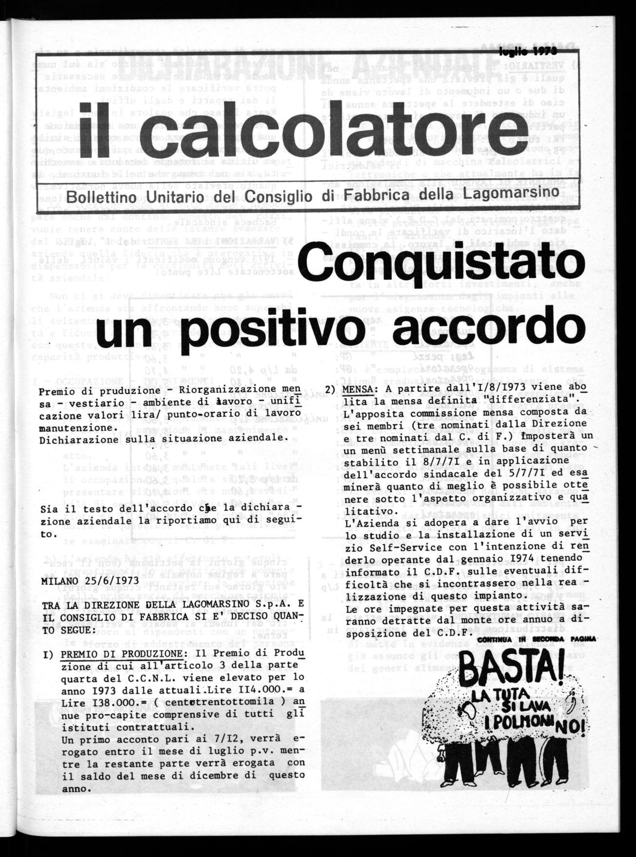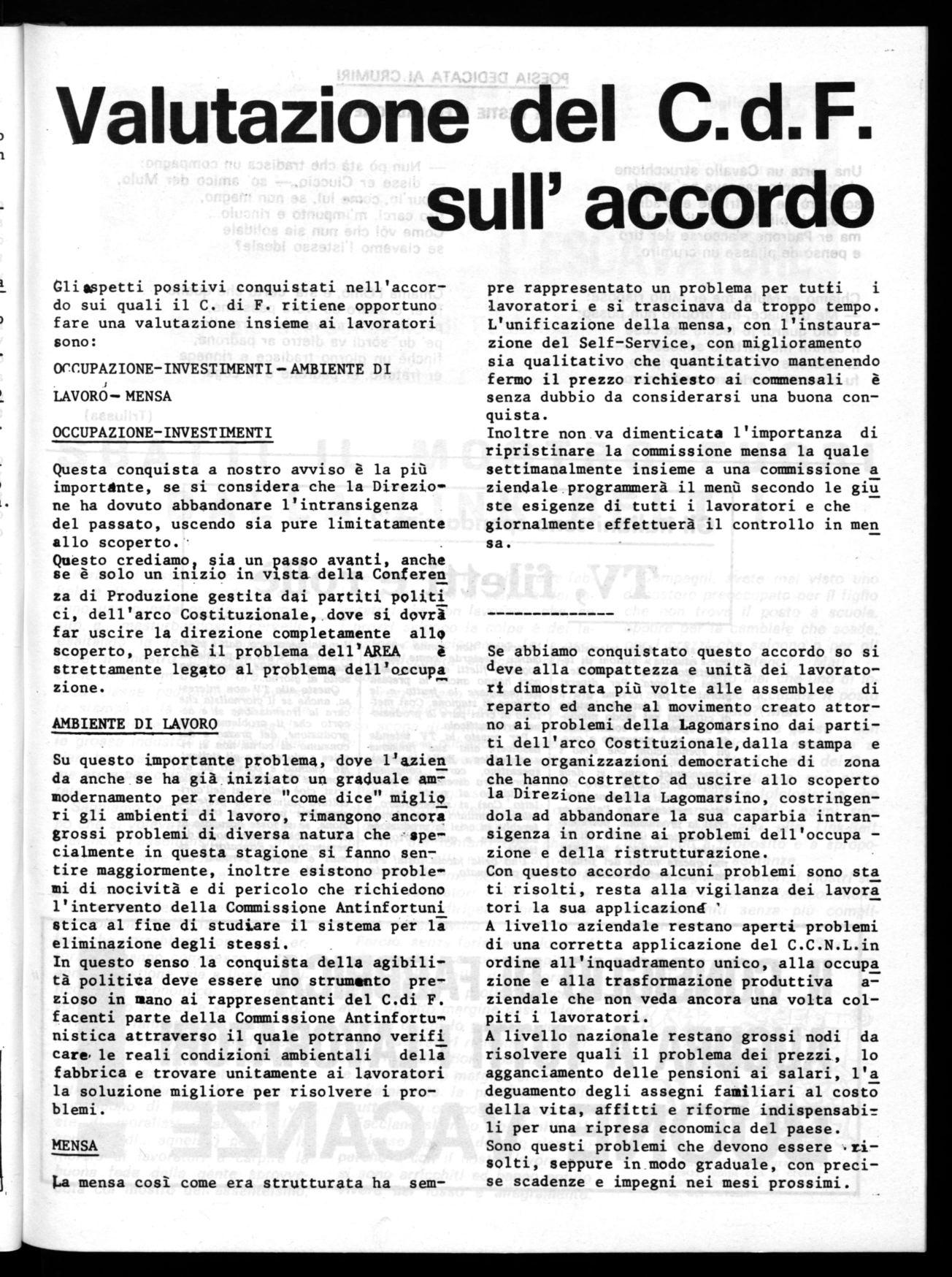 Se abbiamo conquistato questo accordo so si deve alla compattezza e unità dei lavoratori dimostrata più volte alle assemblee di reparto ed anche al movimento creato attorno ai problemi della Lagomarsino dai partiti dell'arco Costituzionale,dalla stampa e dalle organizzazioni democratiche di zona che hanno costretto ad uscire allo scoperto la Direzione della Lagomarsino, costringendola ad abbandonare la sua caparbia intransigenza in ordine ai problemi dell'occupazione e della ristrutturazione.
