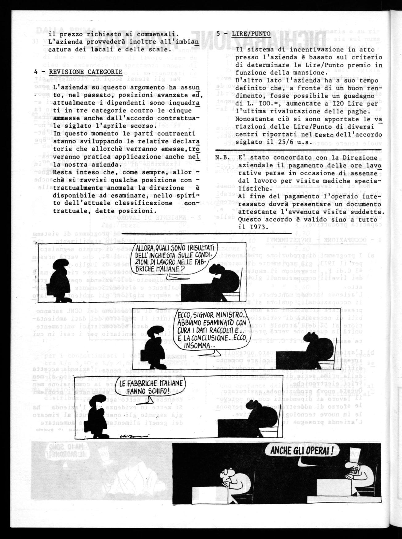 L'azienda su questo argomento ha assun to, nel passato, posizioni avanzate ed, attualmente i dipendenti sono inquadra ti in tre categorie contro le cinque ammesse anche dall'accordo contrattuale siglato l'aprile scorso. In questo momento le parti contraenti stanno sviluppando le relative declara torie che allorchè verranno emesse,tro veranno pratica applicazione anche nel la nostra azienda. Resta inteso che, come sempre, allorchè si ravvisi qualche posizione contrattualmente anomala la direzione è disponibile ad esaminare, nello spirito dell'attuale classificazione nontrattuale, dette posizioni.