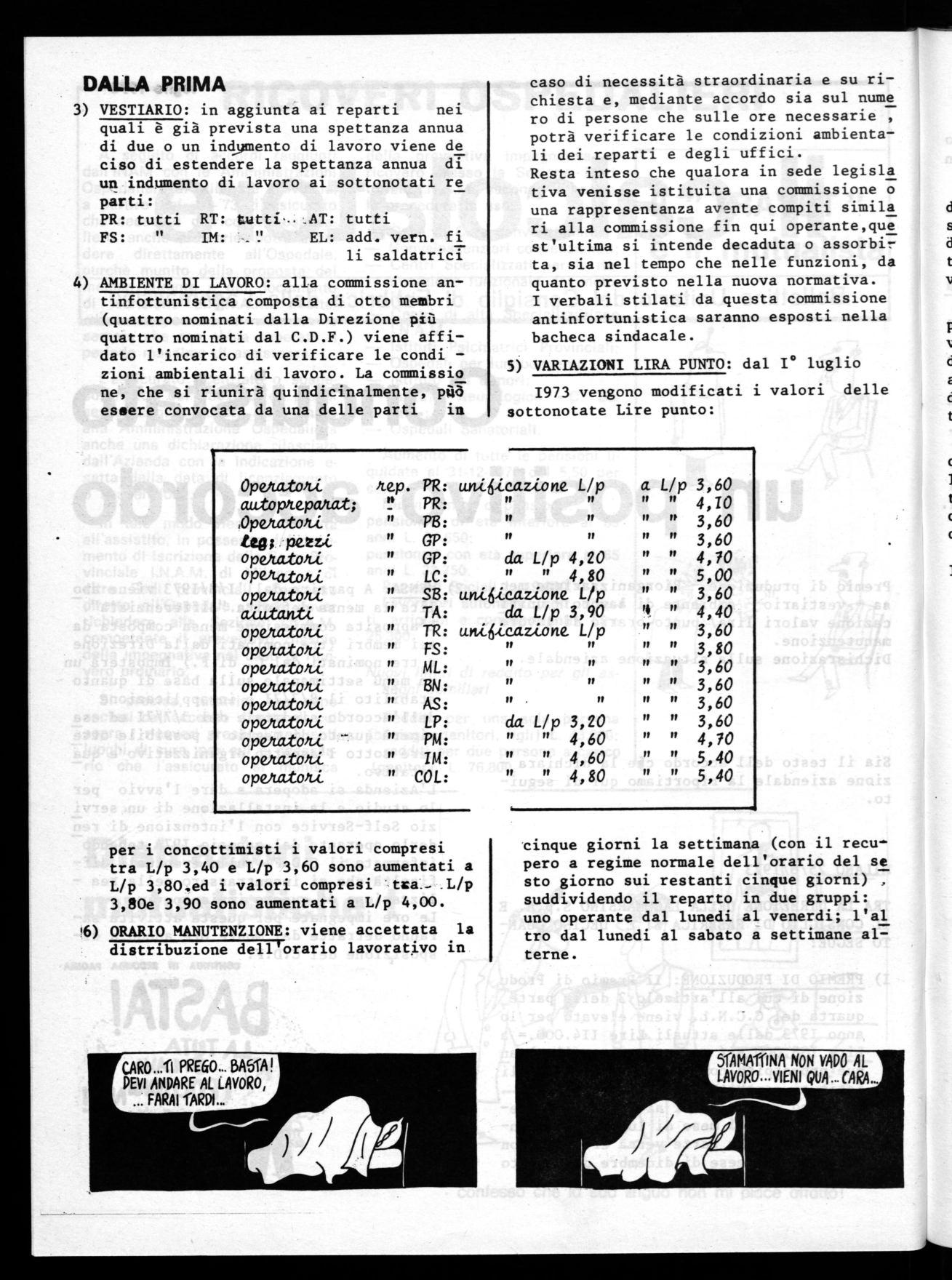 AMBIENTE DI LAVORO: alla commissione antinfortunistica composta di otto membri (quattro nominati dalla Direzione più quattro nominati dal C.D.F.) viene affidato l'incarico di verificare le condizioni ambientali di lavoro. La commissio ne, che si riunirà quindicinalmente, pùv essere convocata da una delle parti in