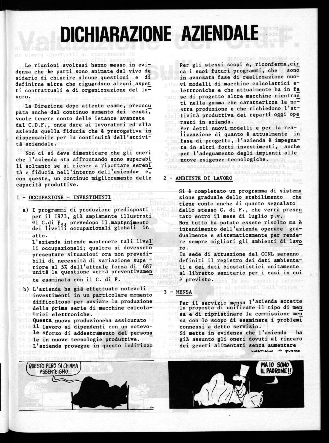 La Direzione dopo attento esame, preoccu pata anche dal continuo aumento dei costi, vuole tenere conto delle istanze avanzate dal C.D.F., onde dare ai lavoratori ed alla azienda quella fiducia che è prerogativa in dispensabile per la continuità dell'attività aziendale.