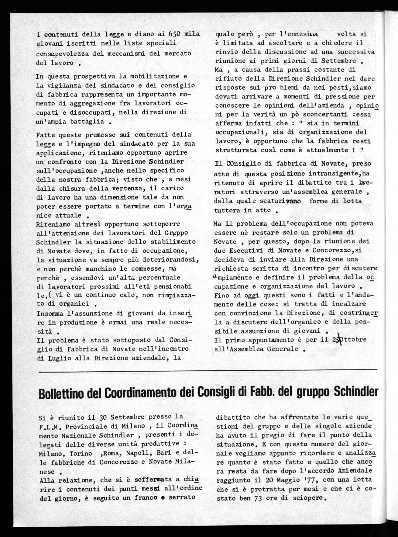 Si è riunito il 30 Settembre presso la F.L.M. Provinciale di Milano , il Coordina mento Nazionale Schindler , presenti i delegati delle diverse unità produttive : Milano, Torino ,Roma, Napoli, Bari e delle fabbriche di Concorezzo e Novate Milanese .