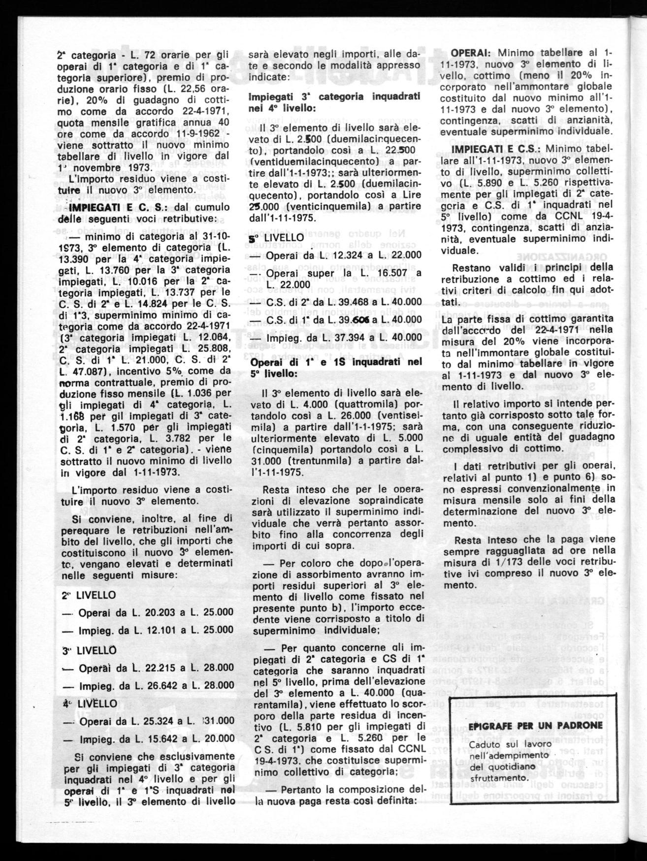 IMPIEGATI E C.S.: Minimo tabellare all'1-11-1973, nuovo 3" elemento di livello, superminimo collettivo (L. 5.890 e L. 5.260 rispettivamente per gli impiegati di 2' categoria e C.S. di 1' inquadrati nel 5° livello) come da CCNL 19-41973, contingenza, scatti di anzianità, eventuale superminimo individuale.