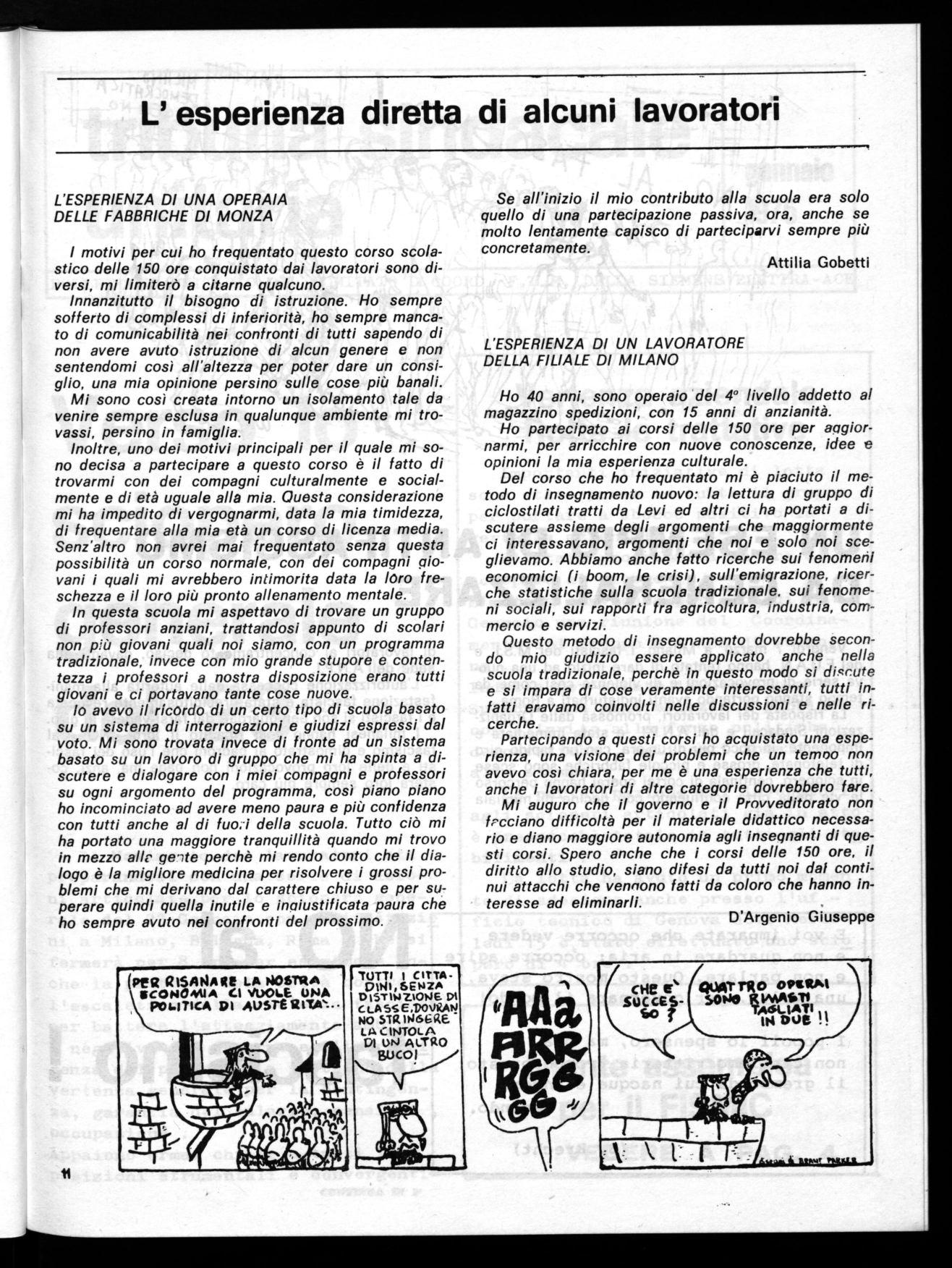 Mi auguro che il governo e il Provveditorato non frcciano difficoltà per il materiale didattico necessario e diano maggiore autonomia agli insegnanti di questi corsi. Spero anche che i corsi delle 150 ore, il diritto allo studio, siano difesi da tutti noi dal continui attacchi che vennono fatti da coloro che hanno interesse ad eliminarli.