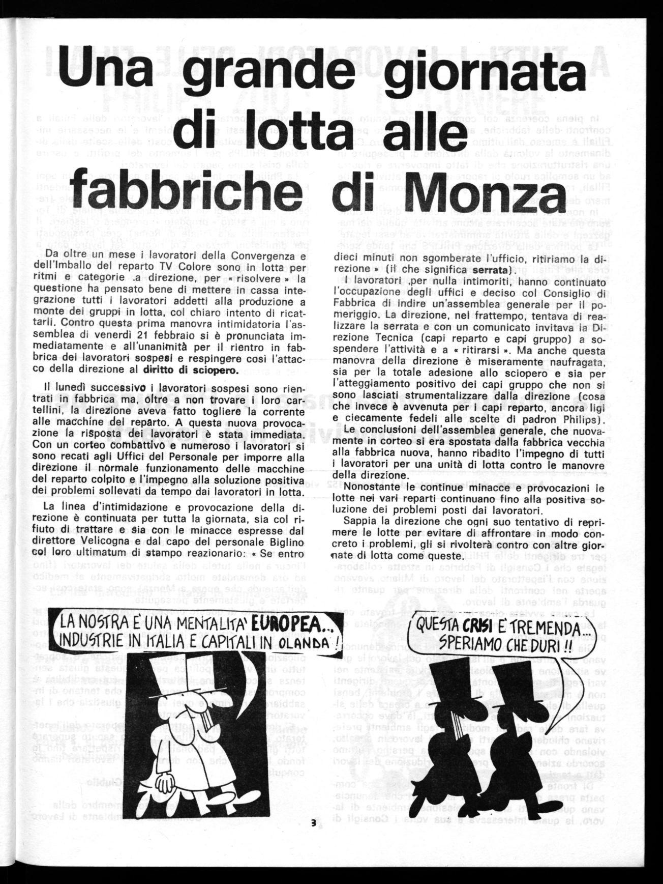Le successive scadenze di lotta hanno visto un'ampia partecipazione nelle fabbriche, ma in alcune situazioni (come al TV bianco e nero) la paura della crisi, l'insicurezza del posto di lavoro, i ricatti padronali e forse anche la mancanza di delegati, hanno creato alcuni uuo'i, in seguito recuperati dalla grossa nartecipazione allo sciopero generale della zona di Monza del 26 febbraio.