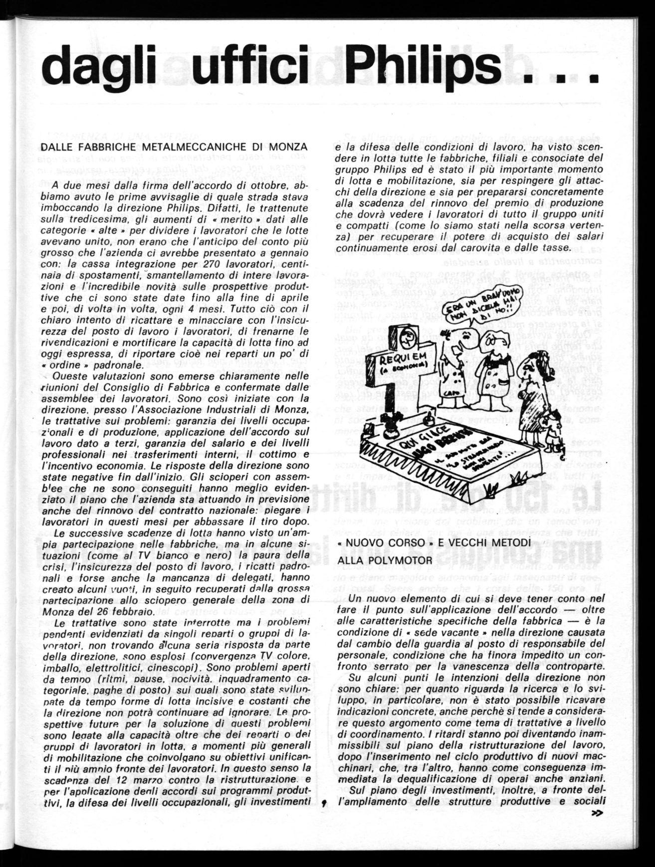 A due mesi dalla firma dell'accordo di ottobre, abbiamo avuto le prime avvisaglie di quale strada stava imboccando la direzione Philips. Difatti, le trattenute sulla tredicesima, gli aumenti di « merito » dati alle categorie « alte » per dividere i lavoratori che le lotte avevano unito, non erano che l'anticipo del conto più grosso che l'azienda ci avrebbe presentato a gennaio con: la cassa integrazione per 270 lavoratori, centinaia di spostamenti, smantellamento di intere lavorazioni e l'incredibile novità sulle prospettive produttive che ci sono state date fino alla fine di aprile e poi, di volta in volta, ogni 4 mesi. Tutto ciò con il chiaro intento di ricattare e minacciare con l'insicurezza del posto di lavoro i lavoratori, di frenarne le rivendicazioni e mortificare la capacità di lotta fino ad oggi espressa, di riportare cioè nei reparti un po' di « ordine » padronale.