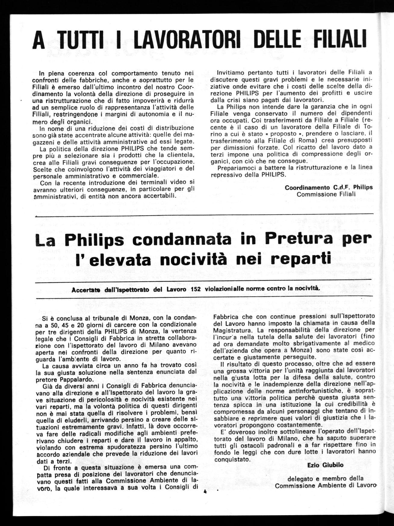 Si è conclusa al tribunale di Monza, con la condanna a 50, 45 e 20 giorni di carcere con la condizionale per tre dirigenti della PHILIPS di Monza, la vertenza legale che i Consigli di Fabbrica in stretta collaborarione con l'ispettorato del lavoro di Milano avevano aperta nei confronti della direzione per quanto riguarda l'amb'ente di lavoro.