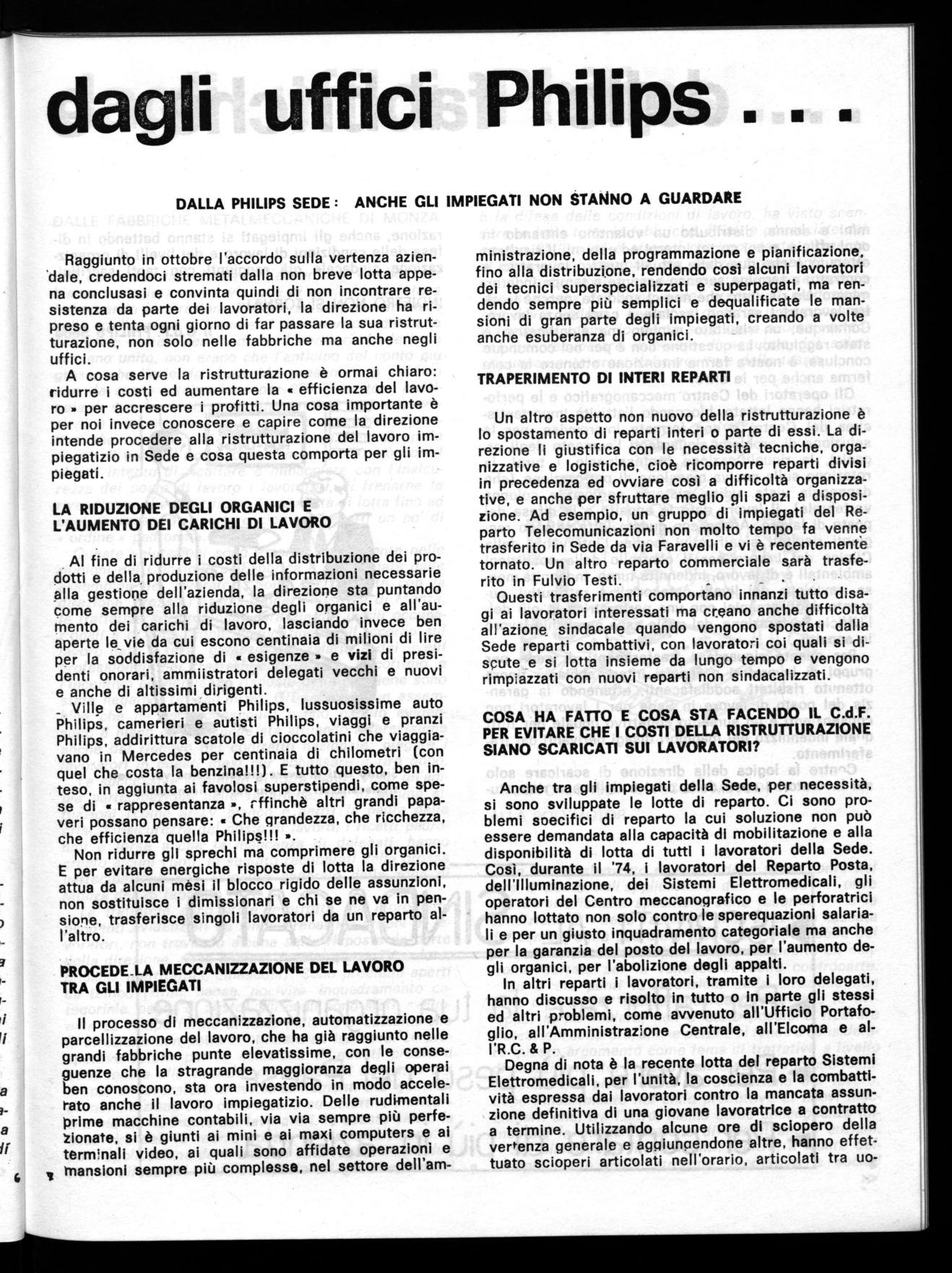 Al fine di ridurre i costi della distribuzione dei prodotti e della, produzione delle informazioni necessarie alla gestione dell'azienda, la direzione sta puntando come sempre alla riduzione degli organici e all'aumento dei carichi di lavoro, lasciando invece ben aperte le_vie da cui escono centinaia di milioni di lire per la soddisfazione di « esigenze • e vizi di presidenti onorari, ammiistratori delegati vecchi e nuovi e anche di altissimi dirigenti. _ Ville e appartamenti Philips, lussuosissime auto Philips, camerieri e autisti Philips, viaggi e pranzi Philips, addirittura scatole di cioccolatini che viaggiavano in Mercedes per centinaia di chilometri (con quel che costa la benzina!!!). E tutto questo, ben inteso, in aggiunta ai favolosi superstipendi, come spese di a rappresentanza -, rffinchè altri grandi papaveri possano pensare: • Che grandezza, che ricchezza, che efficienza quella Philips!!! ».