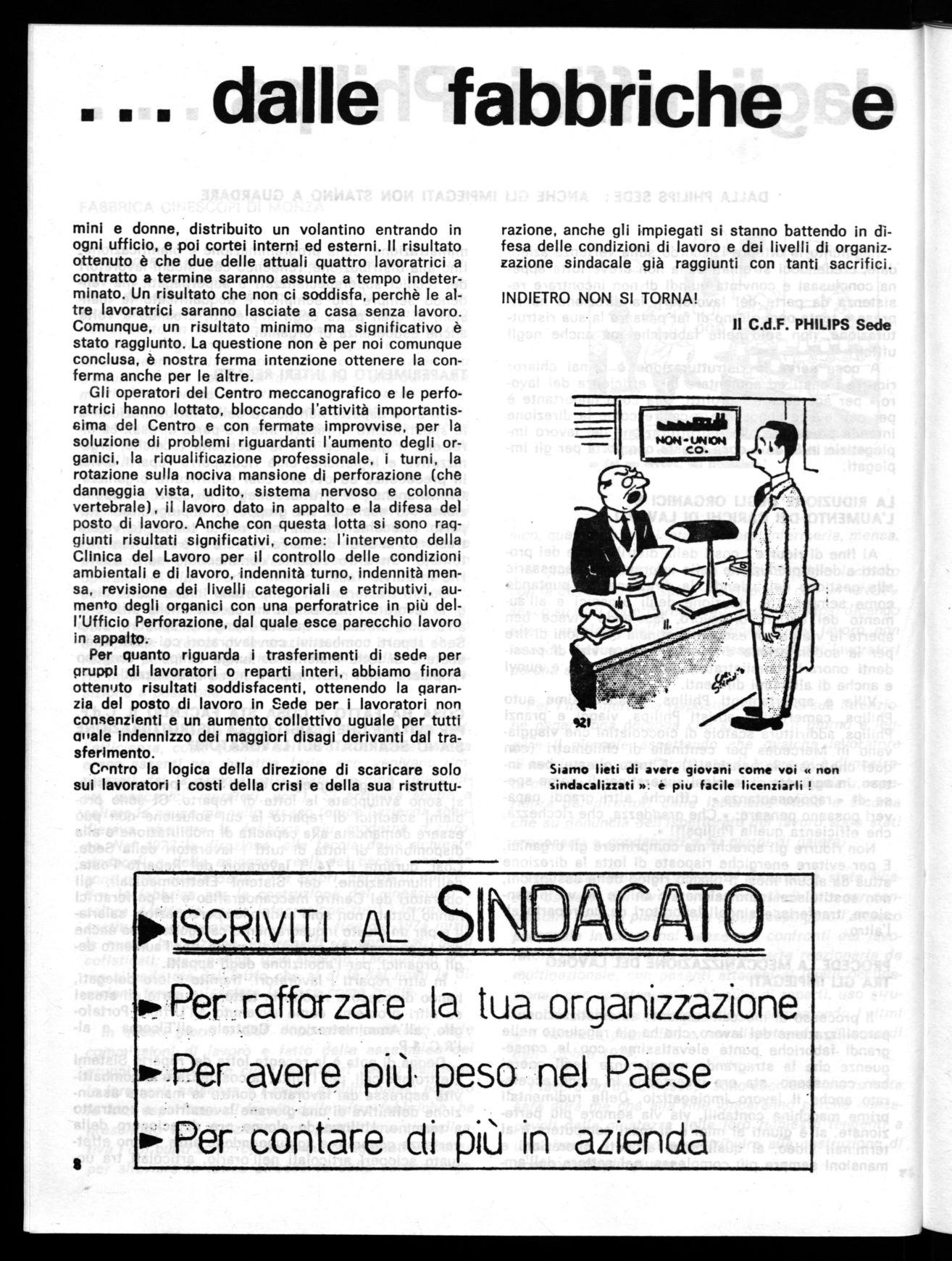 I lavoratori ,per nulla intimoriti, hanno continuato l'occupazione degli uffici e deciso col Consiglio di Fabbrica di indire un'assemblea generale per il pomeriggio. La direzione, nel frattempo, tentava di realizzare la serrata e con un comunicato invitava ia Direzione Tecnica (capi reparto e capi gruppo) a sospendere l'attività e a « ritirarsi ». Ma anche questa manovra della direzione è miseramente naufragata, sia per la totale adesione allo sciopero e sia per l'atteggiamento positivo dei capi gruppo che non si sono lasciati strumentalizzare dalla direzione (cosa che invece è avvenuta per i capi reparto, ancora ligi e ciecamente fedeli alle scelte di padron Philips).