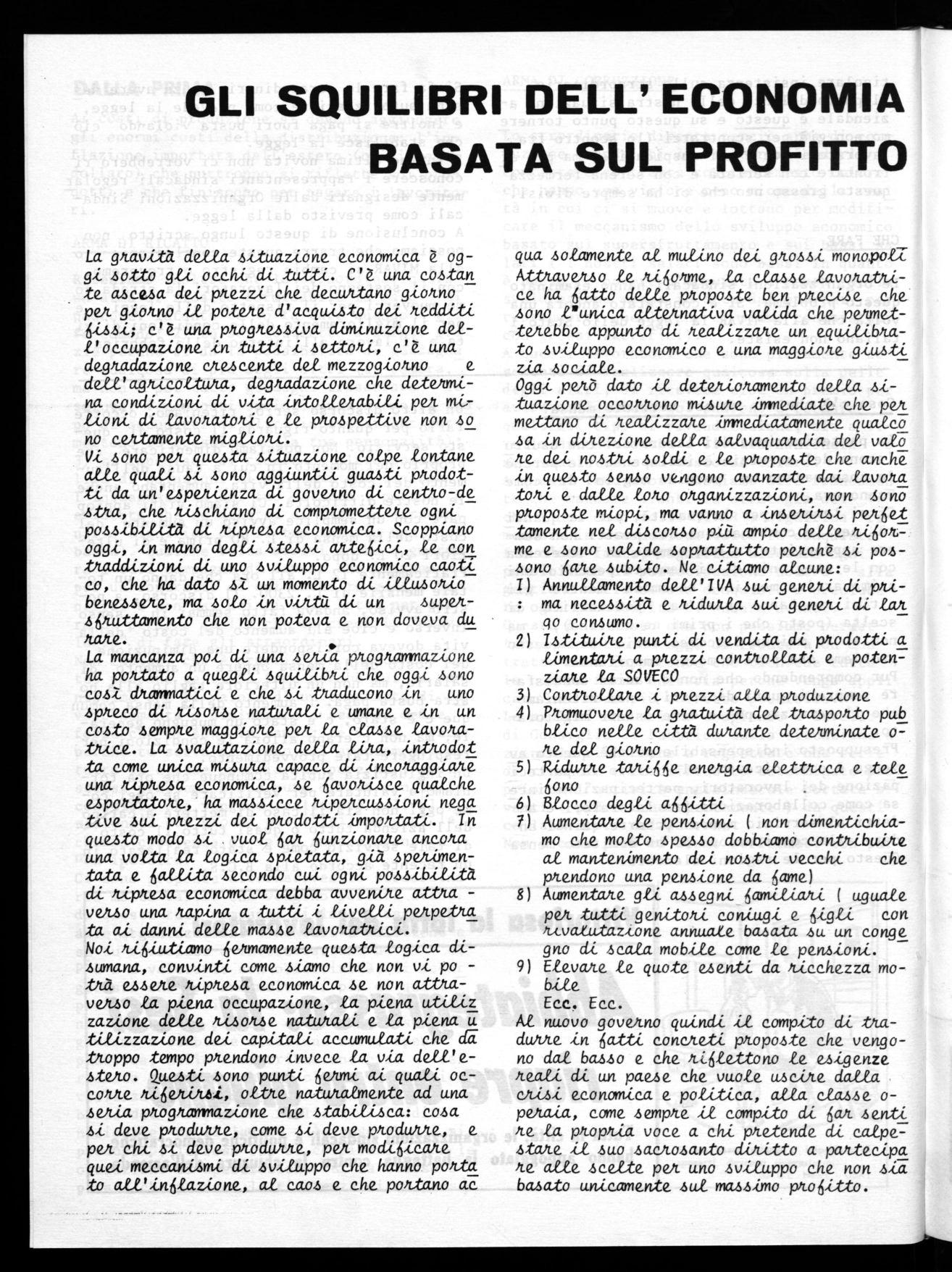 Ci sono proposte alternativeallo straordina rio molto valide che vengono portate avanti da questi tuoi compagni di lavoro assieme alle organizzazioni sindacali e politiche e se tu riuscissi a interessartene un po' di Più e a valutarle con obiettività, ti accor geresti che contano molto di più di quelle poche o tante migliaia di lire che ti rendo no succube del padrone e costringeresti il governo a cambiare direzione nella spesa pubblica, nella ridistribuzione cioè del reddito nazionale che la classe lavoratrice realizza col proprio sudore ( non è la furbizia dei padroni che realizza il reddito nazionale, ma il lavoro , le cose che sí producono, le cose che si coltivano e non le operazioni di speculazione. E' la classe operaia che produce la ricchezza di un paesei