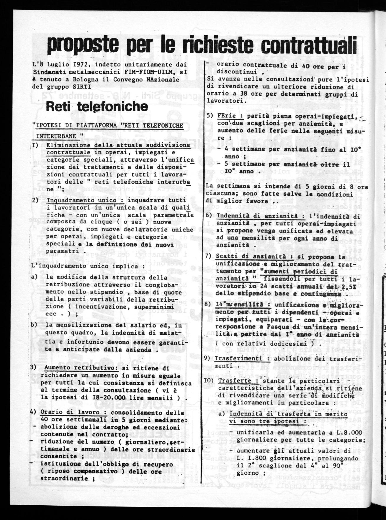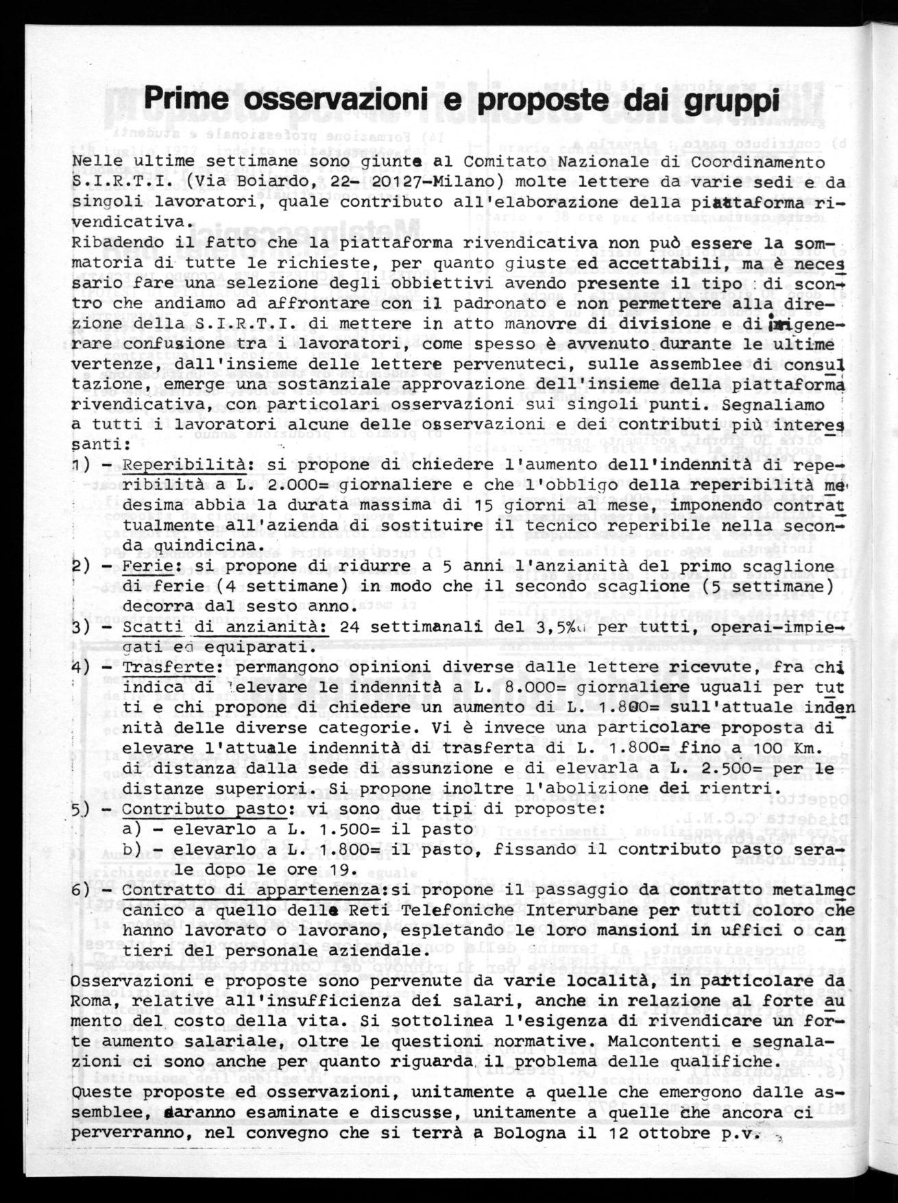 Nelle ultime settimane sono giunte al Comitato Nazionale di Coordinamento S.I.R.T.I. (Via Boiardo, 22- 20127-Milano) molte lettere da varie sedi e da sinaoli lavoratori, quale contributo all'elaborazione della piattaforma rivendicativa.