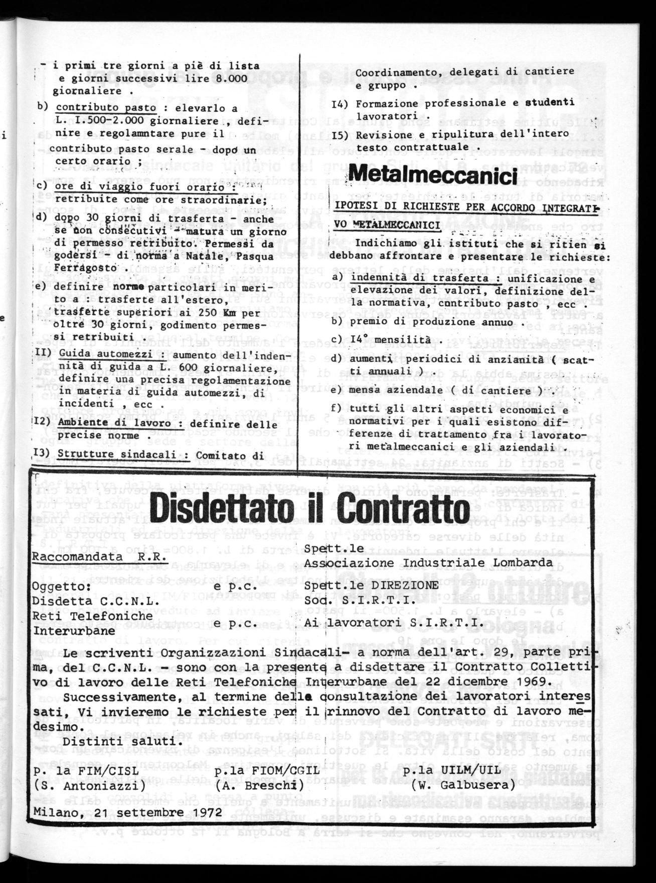 Come pubblichiamo nell'altra pagina, il 21 settembre scorso i segretari generali della FIM/FIOM/UILM di Milano hanno provveduto ad inviare la lettera raccomandata di disdetta del contratto di lavoro. Per cui ritenia mo che entro la terza decade del mese di ottobre debbano avere luogo. le trattative di merito per il rinnovo del contratto di lacoro delle Reti Telefoniche Interurbane.