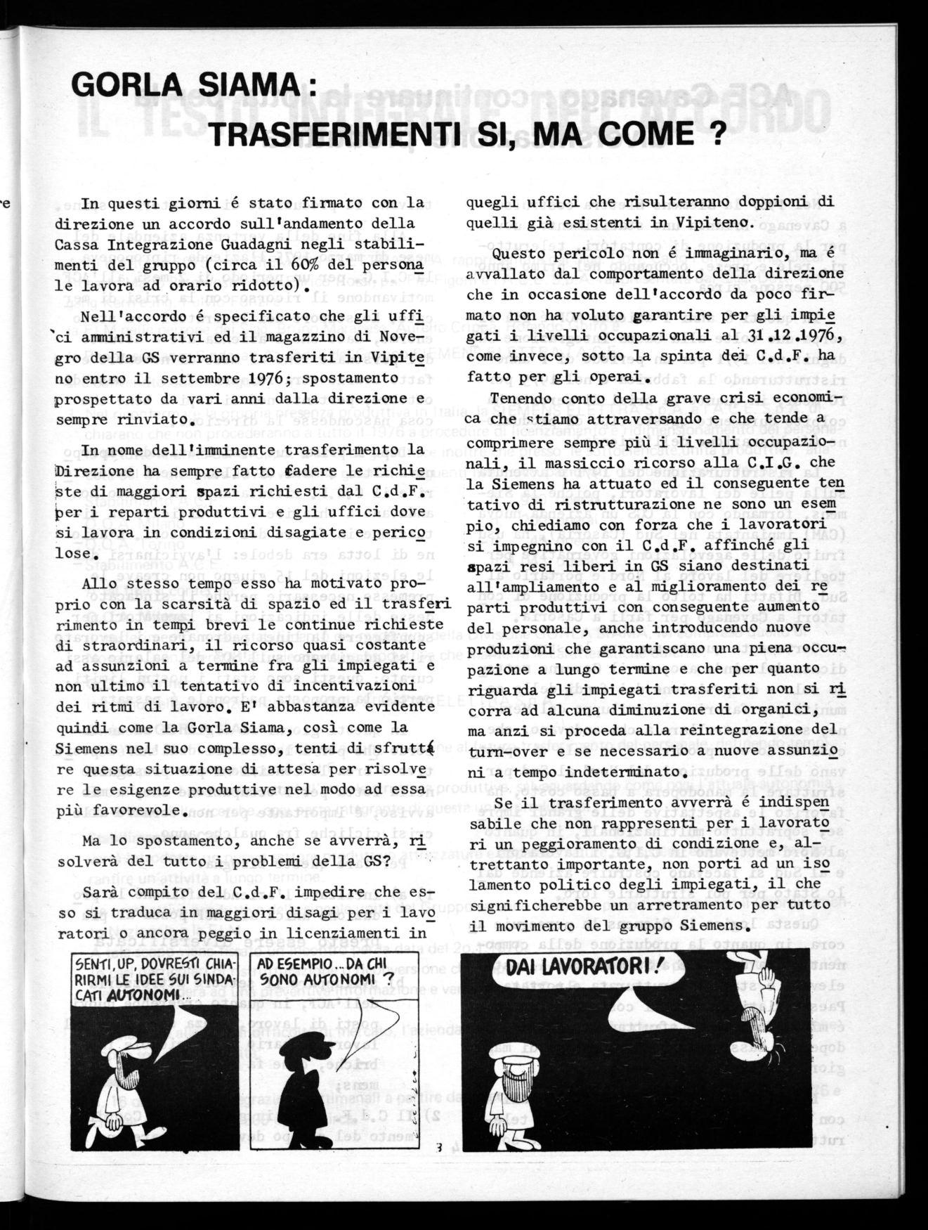 Tenendo conto della grave crisi economi— ca che stiamo attraversando e che tende a comprimere sempre più i livelli occupazio— nali, il massiccio ricorso alla C.I.G. che la Siemens ha attuato ed il conseguente ten tativo di ristrutturazione ne sono un esem pio, chiediamo con forza che i lavoratori si impegnino con il C.d.F. affinché gli spazi resi liberi in GS siano destinati all'ampliamento e al miglioramento dei re parti produttivi con conseguente aumento del personale, anche introducendo nuove produzioni che garantiscano una piena occu— pazione a lungo termine e che per quanto riguarda gli impiegati trasferiti non si ri corra ad alcuna diminuzione di organici, ma anzi si proceda alla reintegrazione del turn—over e se necessario a nuove assunzio ni a tempo indeterminato.