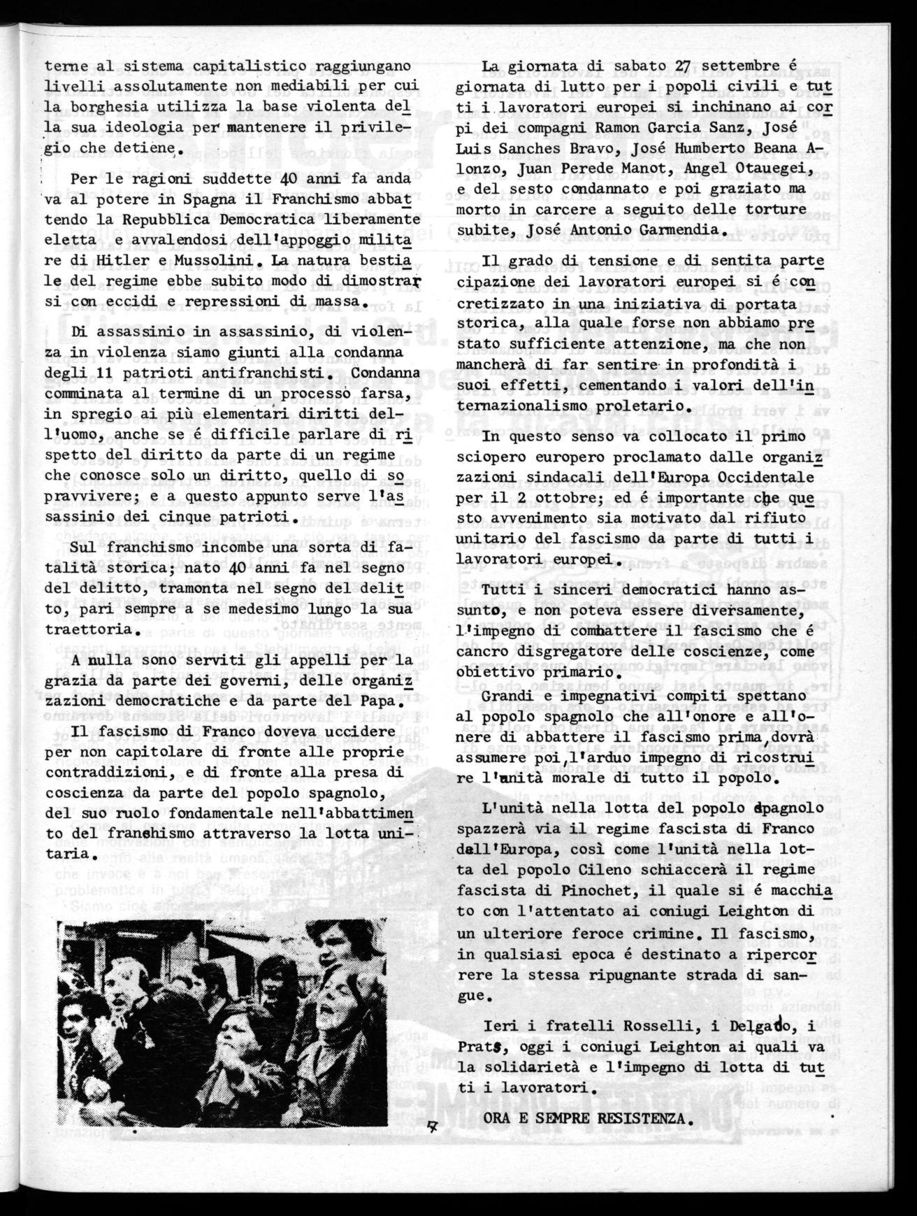 La giornata di sabato 27 settembre é giornata di lutto per i popoli civili e tut ti i lavoratori europei si inchinano ai cor pi dei compagni Ramon Garcia Sanz, José Luis Sanches Bravo, José Humberto Beana Alonzo, Juan Perede Manot, Angel Otauegei, e del sesto condannato e poi graziato ma morto in carcere a seguito delle torture subite, José Antonio Garmendia.