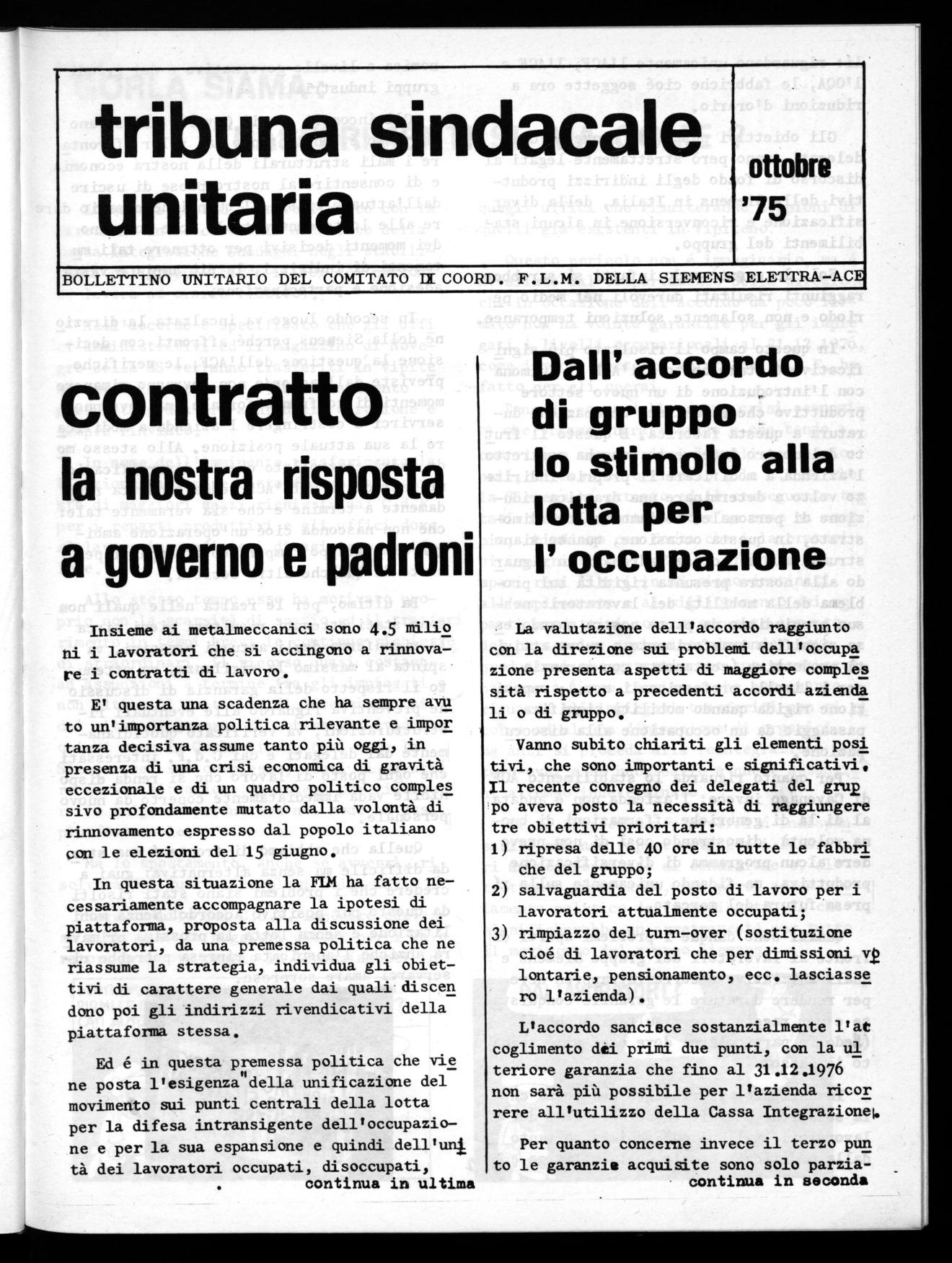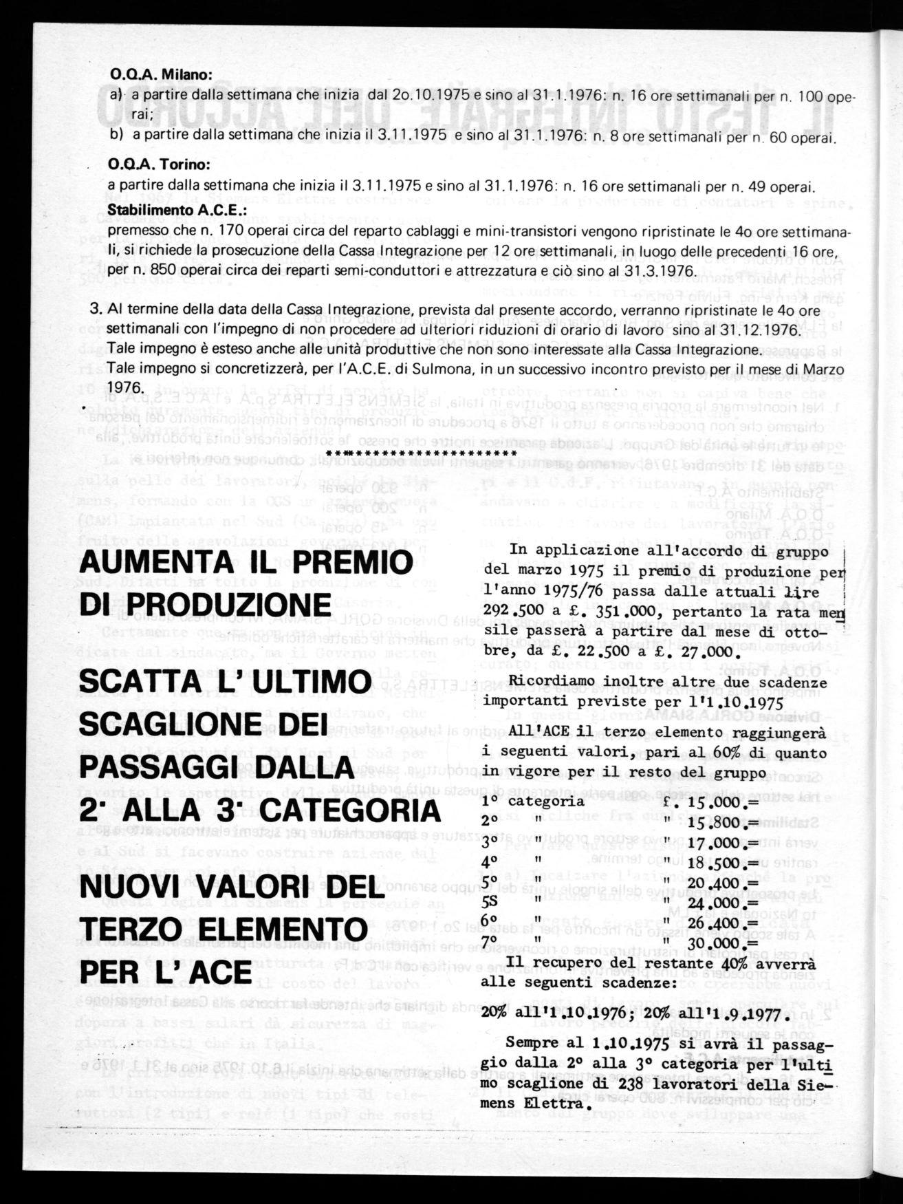 Addi 6 ottobre 1975 tra la SIEMENS ELETTRA S.p.A. rappresentata dai Sigg. Dott. Carlo Pollinini, ing. Oscar Roesch, Mario Paternoster, rag. Enrico Rossi, p.i. Pio Figoni e I'A.C.E. S.p.A. rappresentata dai Sigg. Dott. Wolfgang Kern e ing. Fulvio Fonzi e la FLM nelle persone dei Sigg. Bruno Marabese, Aurelio Crippa, Rolando Ghiro e le Rappresentanze Sindacali Aziendali del Gruppo SIEMENS ELETTRA / A.C.E. si é convenuto quanto segue: