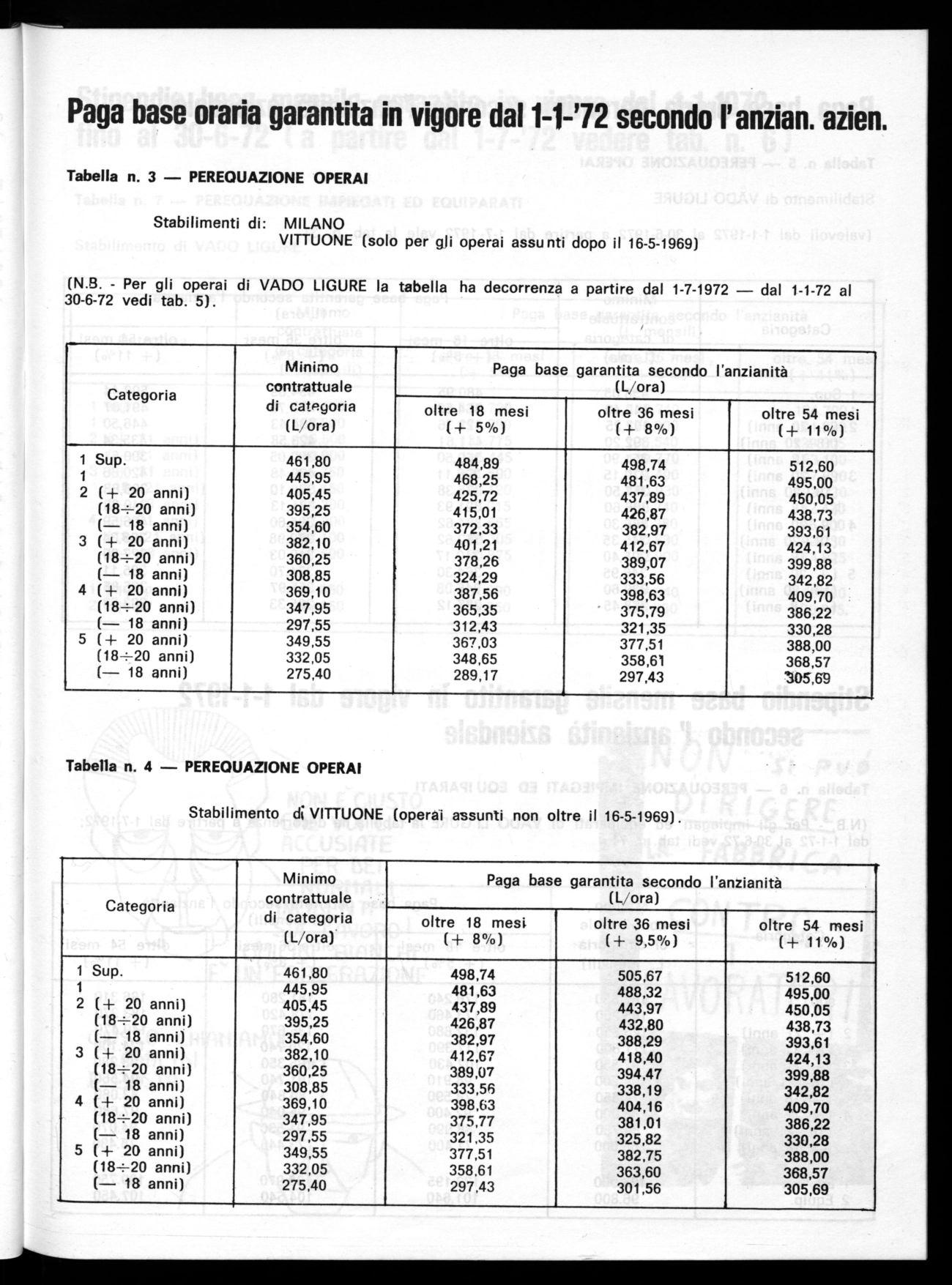 Stabilimento di VITTUONE (operai assunti non oltre il 16-5-1969). Categoria Minimo contrattuale di categoria (L/ora) Paga base garantita secondo l'anzianità (L/ora) oltre 18 mesi (+ 8%) oltre 36 mesi (+ 9,5%) oltre 54 mesi (+ 11%) 1 Sup. 461,80 498,74 505,67 512,60 1 445,95 481,63 488,32 495,00 2 (+ 20 anni) 405,45 437,89 443,97 450,05 (18+20 anni) 395,25 426,87 432,80 438,73 (- 18 anni) 354,60 382,97 388,29 393,61 3 (+ 20 anni) 382,10 412,67 418,40 424,13 (18-:.-20 anni) 360,25 389,07 394,47 399,88 (- 18 anni) 308,85 333,56 338,19 342,82 4 (+ 20 anni) 369,10 398,63 404,16 409,70 (18±20 anni) 347,95 375,77 381,01 386,22 (- 18 anni) 297,55 321,35 325,82 330,28 5 (+ 20 anni) 349,55 377,51 382,75 388,00 (18±20 anni) 332,05 358,61 363,60 368,57 (- 18 anni) 275,40 297,43 301,56 305,69