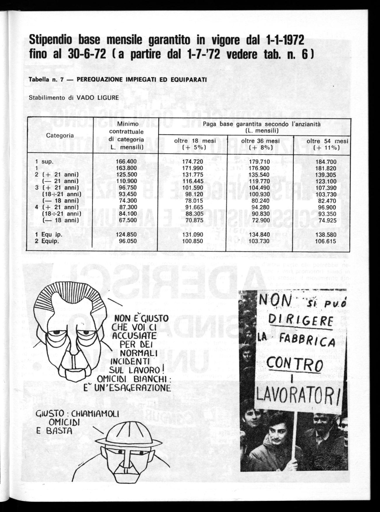 L'accordo sulla perequazione, anche se non risolve a fondo i problemi derivanti dalla politica di discriminazione retributiva operata dalla direzione, ha un grande valore di principio in quanto è la prima volta che al TIBB si è riusciti ad affrontare un argomento sul quale il padronato vuole avere la massima libertà. Consideriamo. evidentemente appena aperto questo problema, che sarà sicuramente ripreso per essere perfezionato quando si ripresenterà l'occasione. Le tabelle n. 3-4-5-6-7 riportano le paghe orarie e le retribuzioni mensili garantite secondo l'anzianità maturata in azienda. A partire dal 1-1-1972 tutti i lavoratori che si trovano al disotto deile retribuzioni indicate dovranno avere un corrispondente aumento.