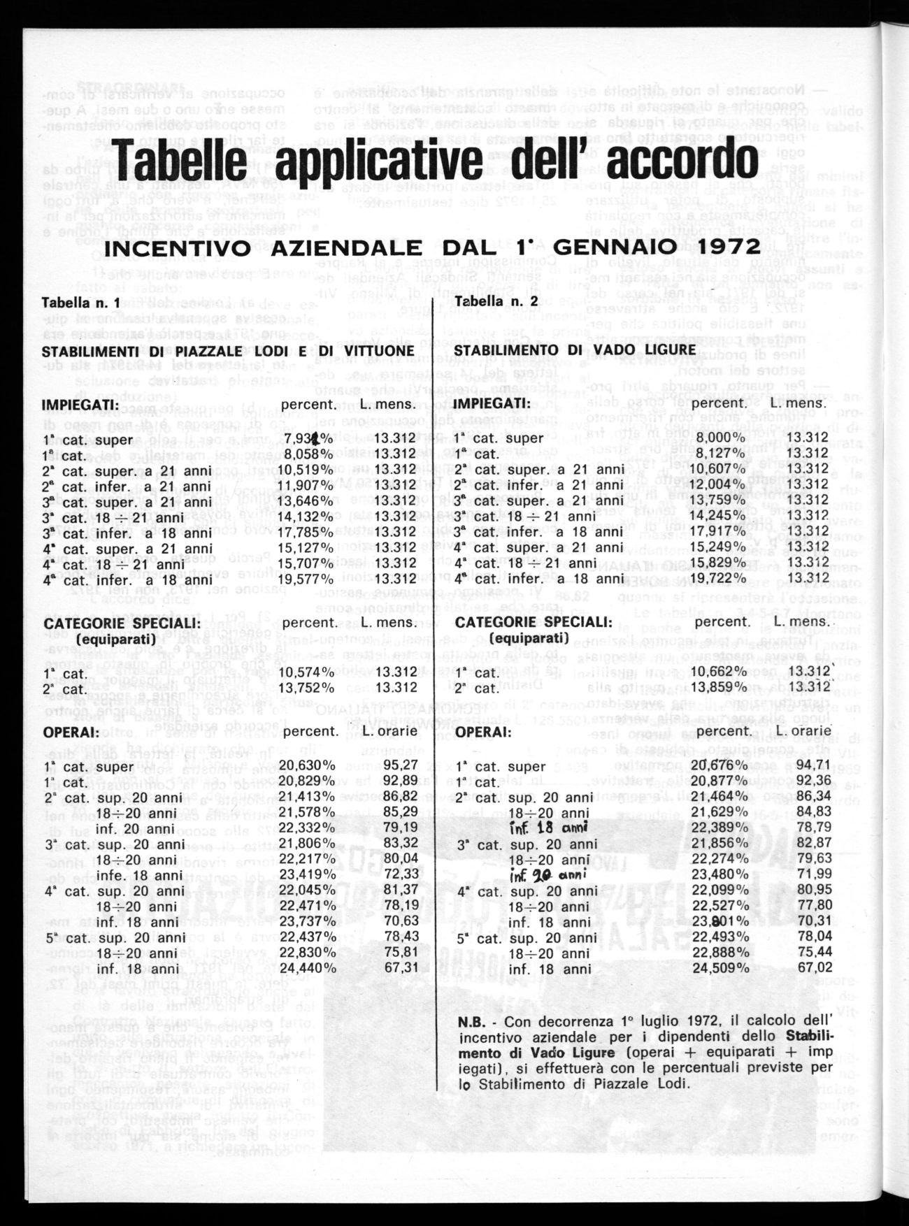 N.B. - Con decorrenza 1° luglio 1972, il calcolo dell' incentivo aziendale per i dipendenti dello Stabilimento di Vado Ligure (operai + equiparati + imp iegati), si effettuerà con le percentuali previste per lo Stabilimento di Piazzale Lodi.