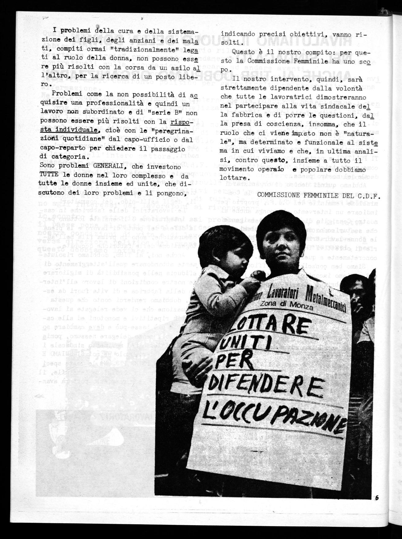 Il nostro intervento, quindi, sarà strettamente dipendente dalla volontà che tutte le lavoratrici dimostreranno nel partecipare alla vita sindacale del la fabbrica e di porre le questioni, dal la presa di coscienza, insomma, che il ruolo che ci viene imp_sto non è "naturale", ma determinato e funzionale al siste ma in cui viviamo e che, in ultima analisi, contro questo, insieme a tutto il movimento operaio e popolare dobbiamo lottare.