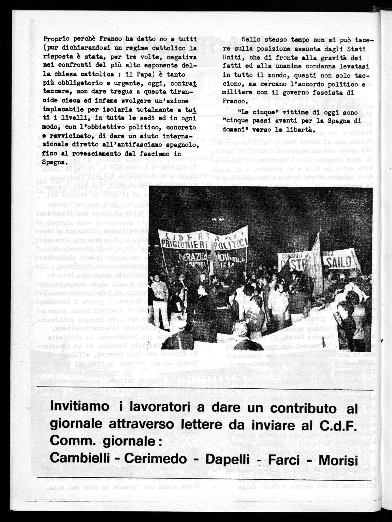 Si estende tuttora, quotidianamente, la lotta di tutti gli antifascisti, perchè sia cancellata finalmente dal nostro conti nente la vergogna del fascismo, che insanguina la Spagna da quarant'anni.