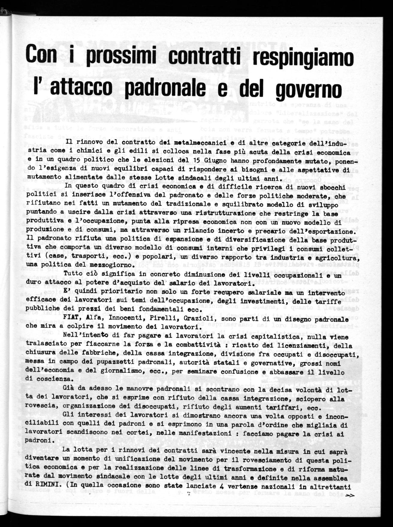 Il rinnovo del contratto dei metalmeccanici e di altre categorie dell'industria come i chimici e gli edili si colloca nella fase più acuta della crisi economica e in un quadro politico che le elezioni del 15 Giugno hanno profondamente mutato, ponendo l'esigenza di nuovi equilibri capaci di rispondere ai bisogni e alle aspettative di mutamento alimentate dalle stesse Lotte sindacali degli ultimi anni.