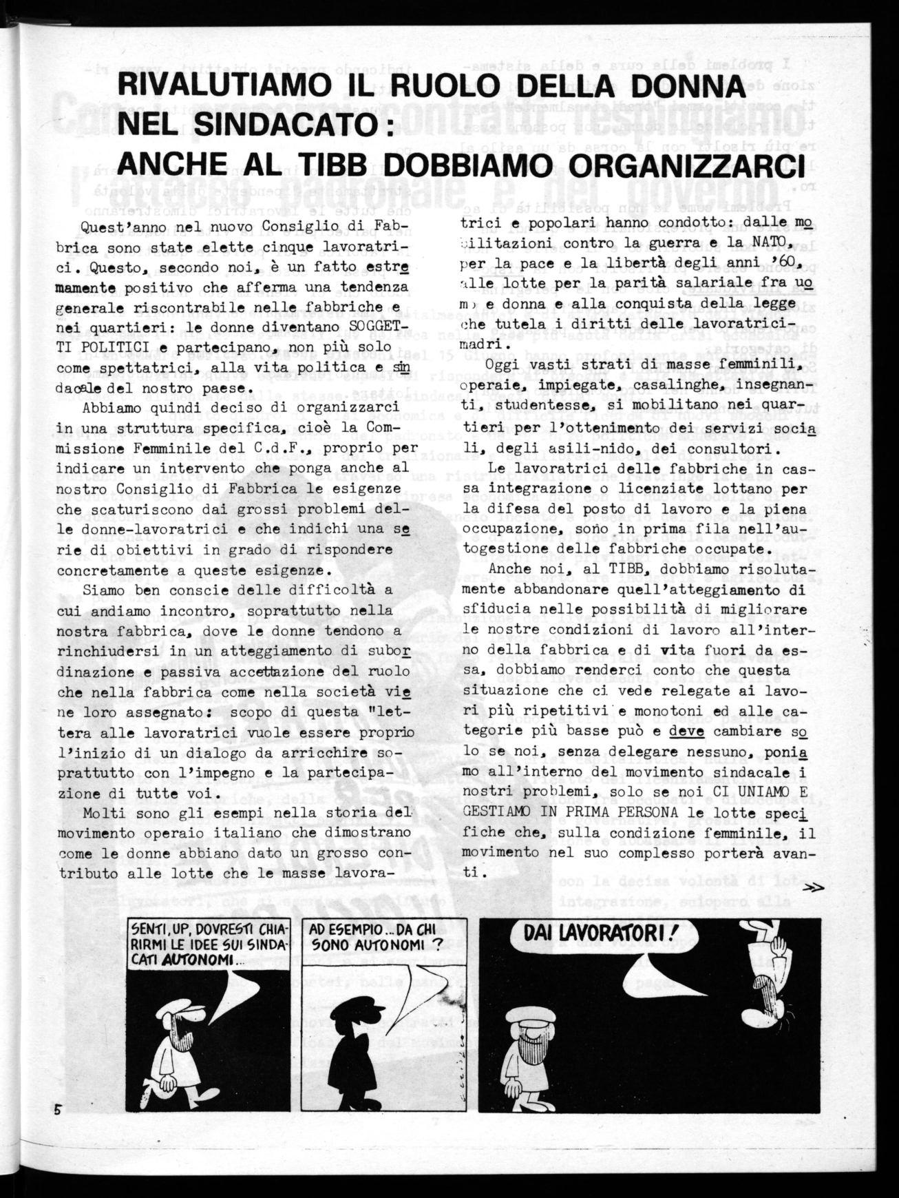 Anche noi, al TIBB, dobbiamo risolutamente abbandonare quell'atteggiamento di sfiducia nelle possibilità di migliorare le nostre condizioni di lavoro all'interno della fabbrica e di vita fuori da essa, dobbiamo renderci conto che questa situazione che ci vede relegate ai lavori più ripetitivi e monotoni ed alle categorie più basse pub e deve cambiare so lo se noi, senza delegare nessuno, ponia mo all'interno del movimento sindacale i nostri problemi, solo se noi CI UNIAMO E GESTIAMO IN PRIMA PERSONA le lotte specj fiche che, sulla condizione femminile, il movimento nel suo complesso porterà avanti.