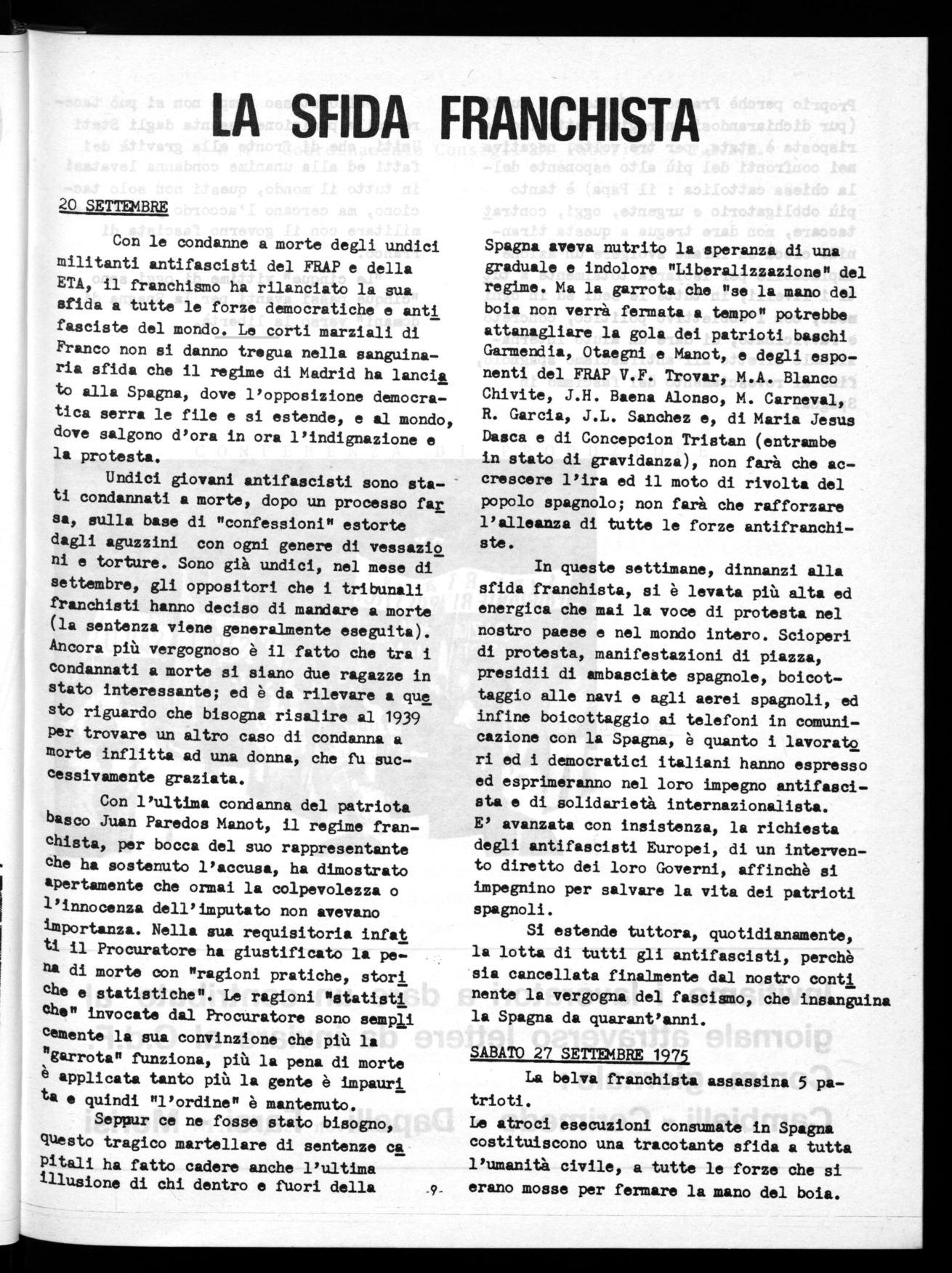 Con le condanne a morte degli undici militanti antifascisti del FRAP e della ETA, il franchismo ha rilanciato la sua sfida a tutte le forze democratiche e enti fasciste del mondo. Le corti marziali di Franco non si danno tregua nella sanguinaria sfida che il regime di Madrid ha lancia to alla Spagna, dove l'opposizione democratica serra le file e si estende, e al mondo, dove salgono d'ora in ora l'indignazione e la protesta.