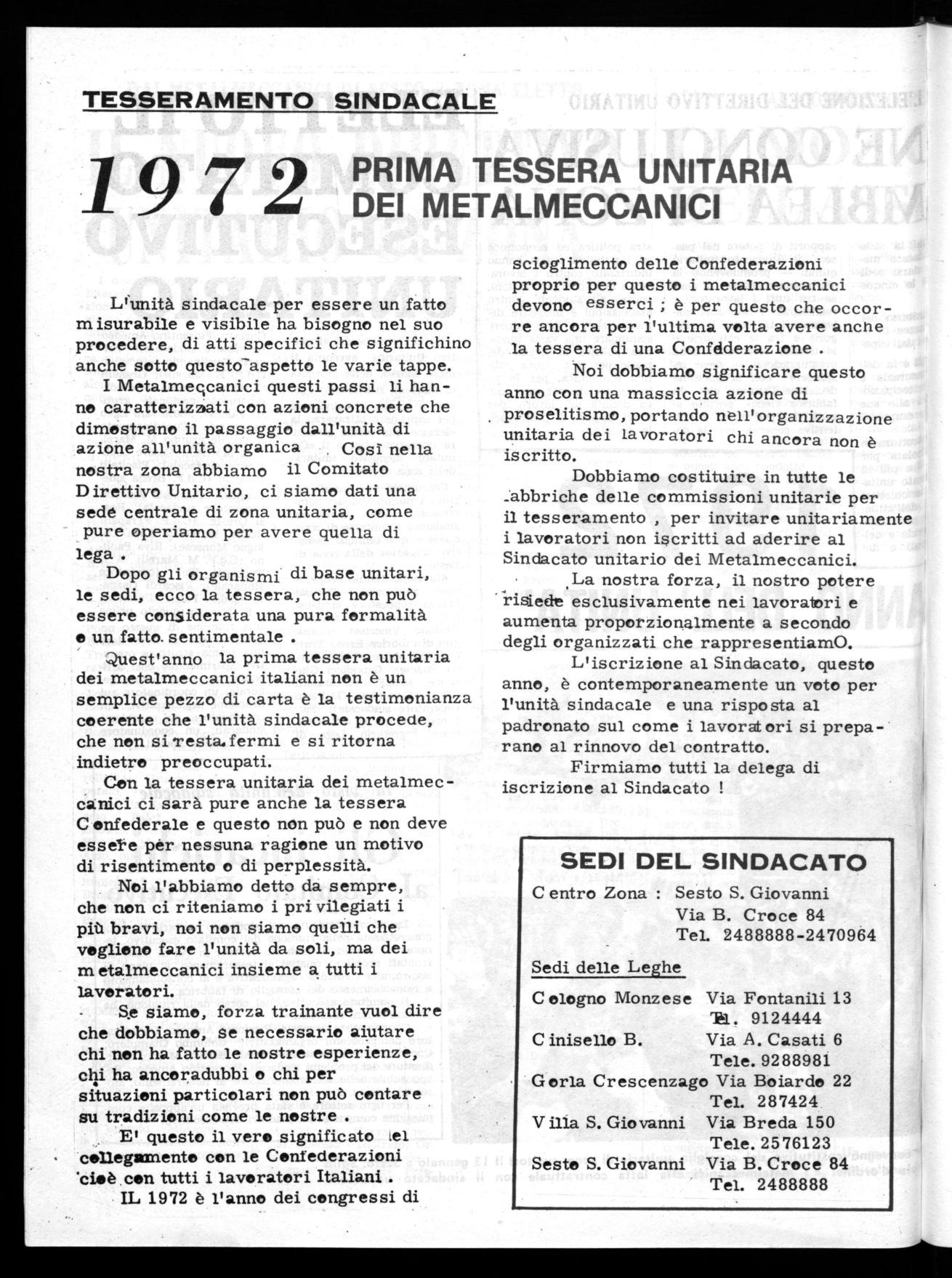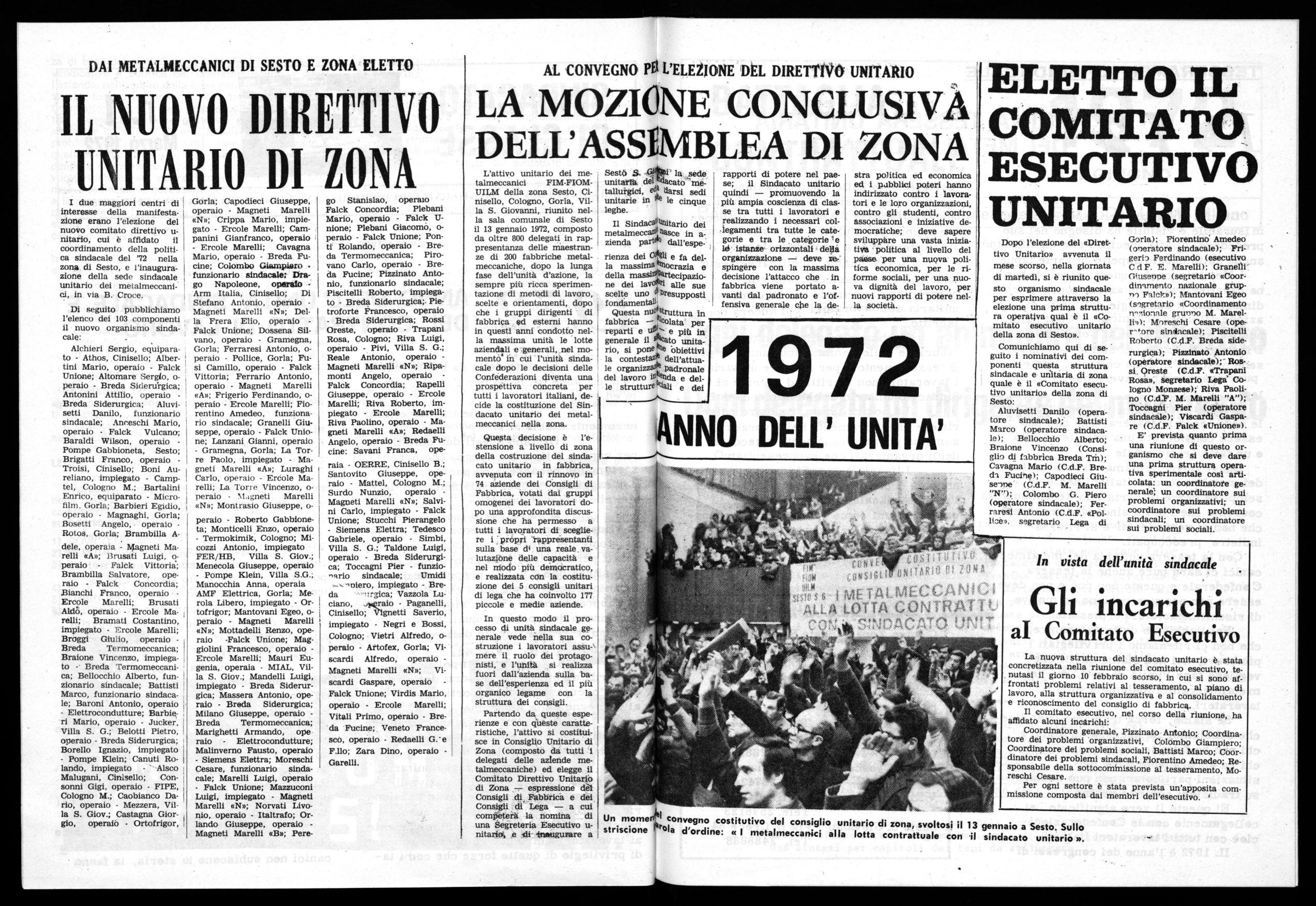 L'attivo unitario dei metalmeccanici FIM-FIOMUILM della zona Sesto, Cinisello, Cologno, Gorla, Villa S. Giovanni, riunito nella sala comunale di Sesto il 13 gennaio 1972, composto da oltre 800 delegati in rappresentanza delle maestranze di 200 fabbriche metalmeccaniche, dopo la lunga fase dell'unità d'azione, la sempre più ricca sperimentazione di metodi di lavoro, scelte e orientamenti, dopo che i gruppi dirigenti di fabbrica ed esterni hanno in questi anni condotto nella massima unità le lotte aziendali e generali, nel momento' in cui l'unità sindacale dopo le decisioni delle Confederazioni diventa una prospettiva concreta per tutti i lavoratori italiani, decide la costituzione del Sindacato unitario dei metalmeccanici nella zona.