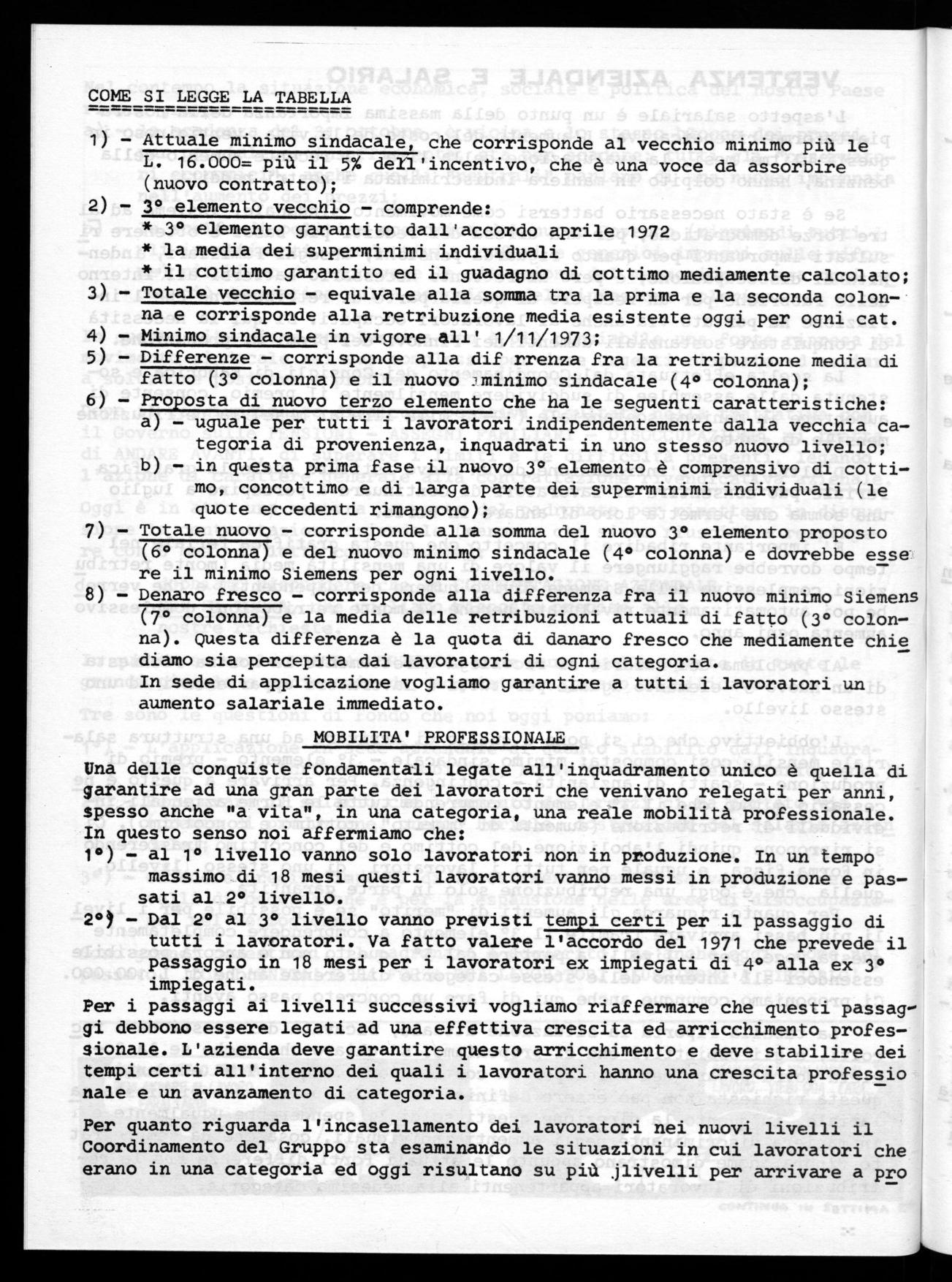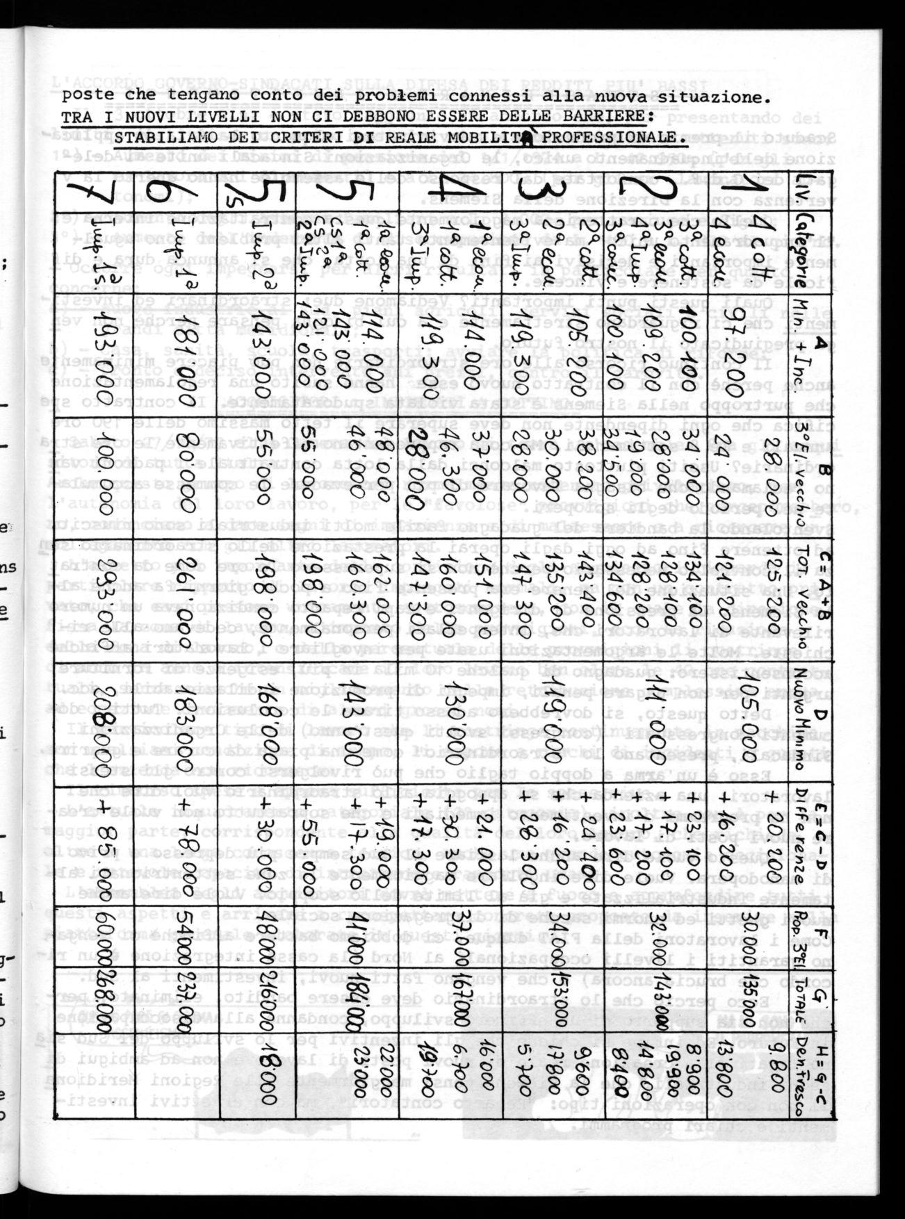 La tabella riporta la situazione attuale, ricavata dai questionari rac colti, e gli obbiettivi che ci proponiamo. E' chiaro che anche se la Società dovrà pagare dei soldi per la costituzione di questi 3° elementi, questa richiesta non può essere definita se non in parte, una richiesta sa lariale, in quanto la direzione questi soldi li spenderebbe ugualmente e .1 in maniera discriminante negli aumenti individuali, cosa che ha sempre fat to finora, come dimostrano appunto le attuali forti differenze fra le retribuzioni di lavoratori appartenenti alla medesima categoria.