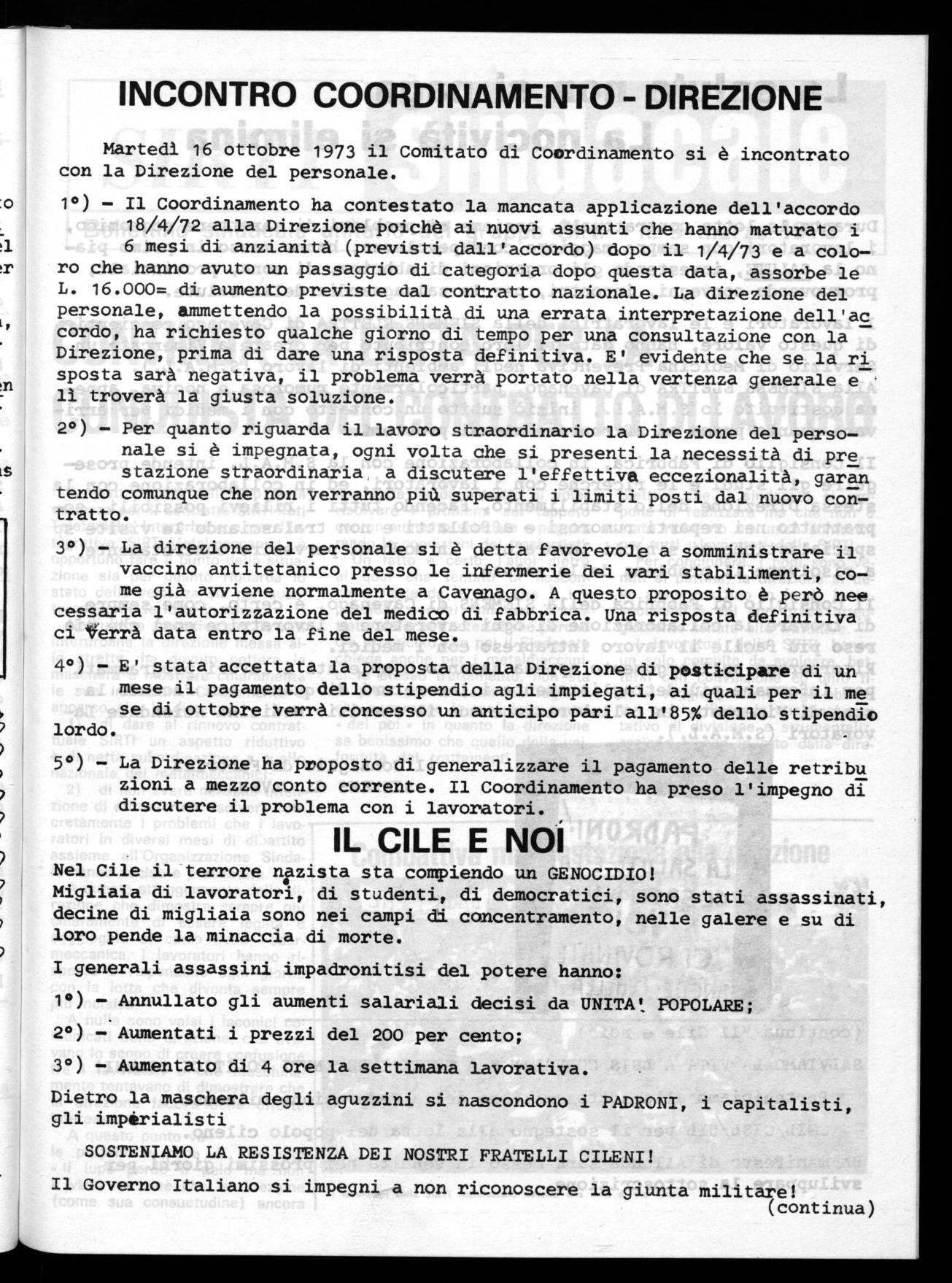 Oltre a questo collegamento con il Coordinamento, il Consiglio di'Fabbrica, ha subito posto alla direzione romana alcuni problemi per i quali è necessaria un'immediata soluzione.