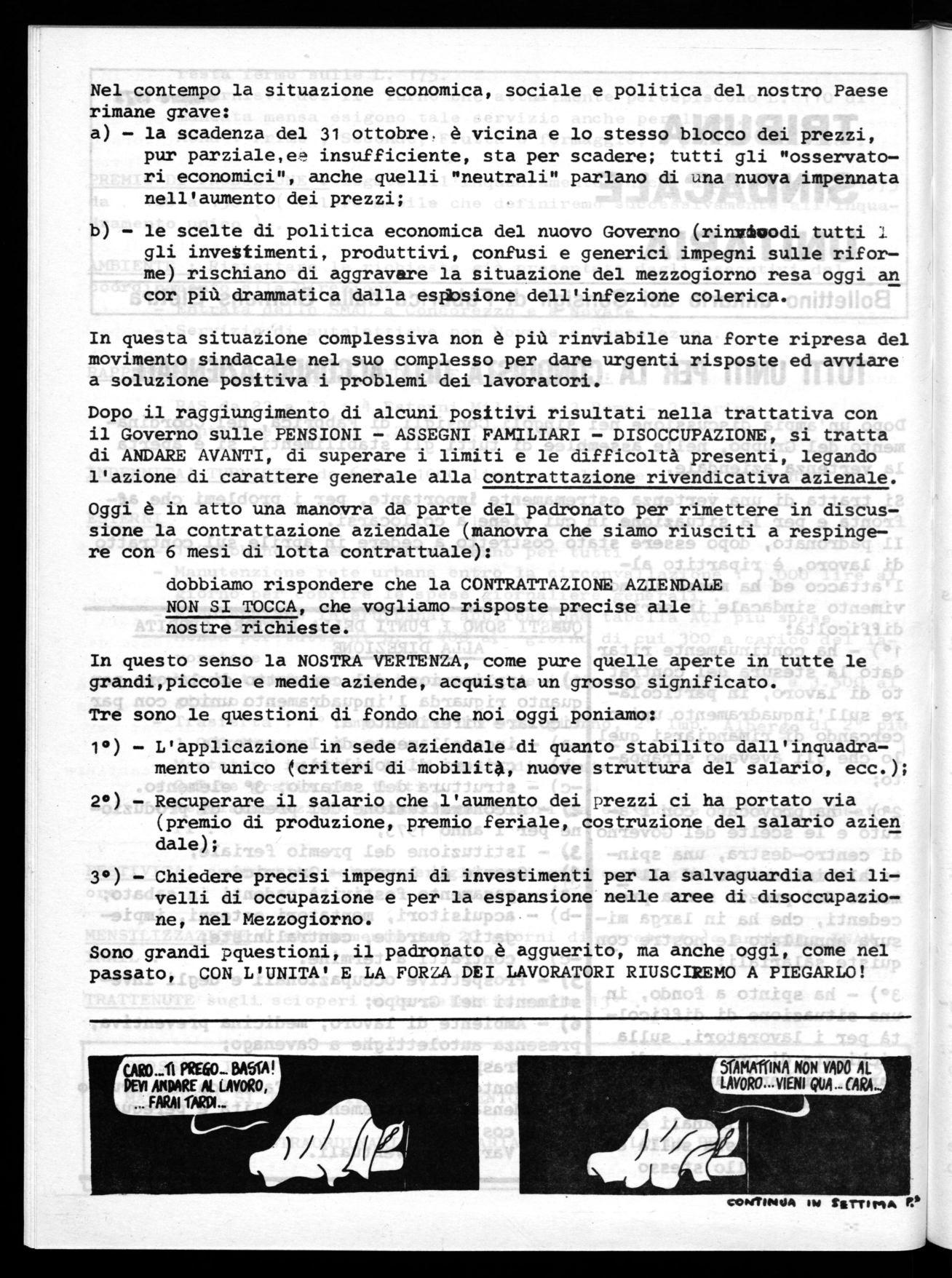 Dopo il raggiungimento di alcuni positivi risultati nella trattativa con il Governo sulle PENSIONI - ASSEGNI FAMILIARI - DISOCCUPAZIONE, si tratta di ANDARE AVANTI, di superare i limiti e le difficoltà presenti, legando l'azione di carattere generale alla contrattazione rivendicativa azienale.