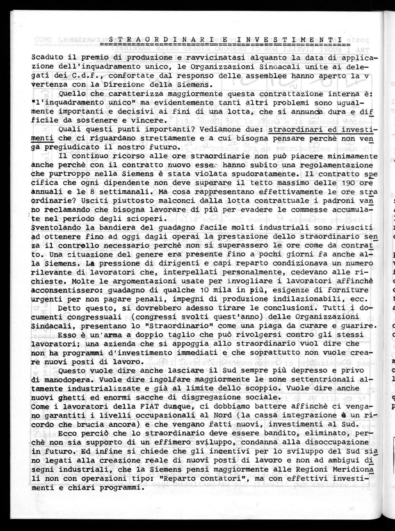Come i lavoratori della FIAT dunque, ci dobbiamo battere affinchè ci vengano garantiti i livelli occupazionali al Nord (la cassa integrazione è un ricordo che brucia ancora) e che vengano fatti nuovi, investimenti al Sud. Ecco perciò che lo straordinario deve essere bandito, eliminato, perchè non sia supporto di un effimero sviluppo, condanna alla disoccupazione in futuro. Ed infine si chiede che gli incentivi per lo sviluppo del Sud sia. no legati alla creazione reale di nuovi posti di lavoro e non ad ambigui di segni industriali, che la Siemens pensi maggiormente alle Regioni Meridione li non con operazioni tipo: "Reparto contatori", ma con effettivi investimenti e chiari programmi.