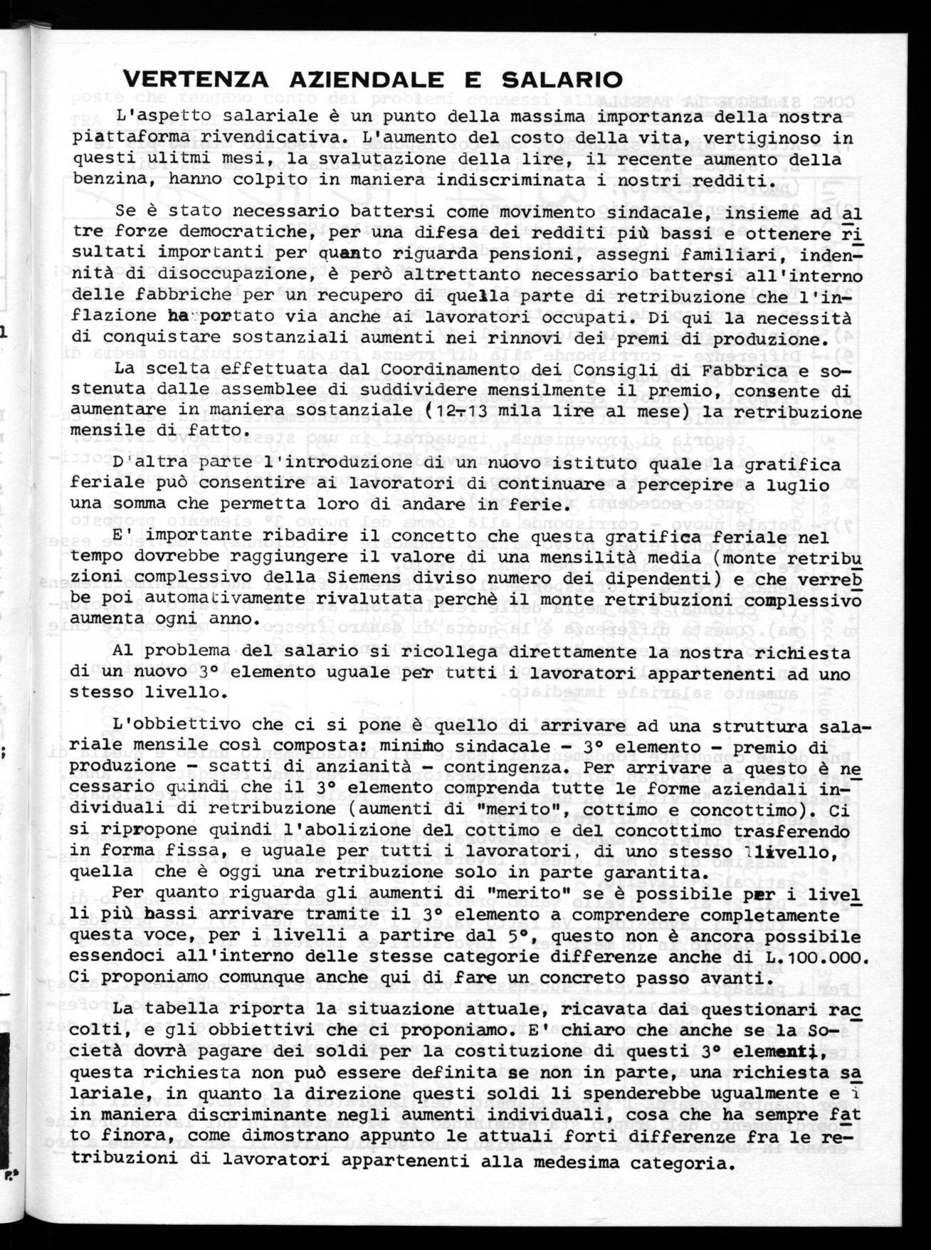 L'aspetto salariale è un punto della massima importanza della nostra piattaforma rivendicativa. L'aumento del costo della vita, vertiginoso in questi ulitmi mesi, la svalutazione della lire, il recente aumento della benzina, hanno colpito in maniera indiscriminata i nostri redditi.